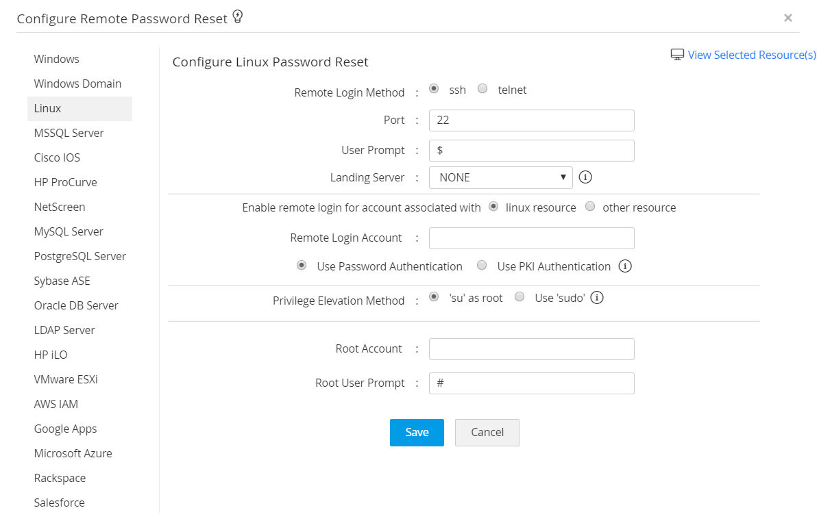 注記:また、SSH コマンド セットを使用して、Linux、IBM AIX、HP UX、Solaris、Mac OS、VMWare ESXi およびその他の Linux または Unix ベースのリソース タイプのリモート パスワード リセットを構成することもできます。詳細については、ここをクリックしてください。