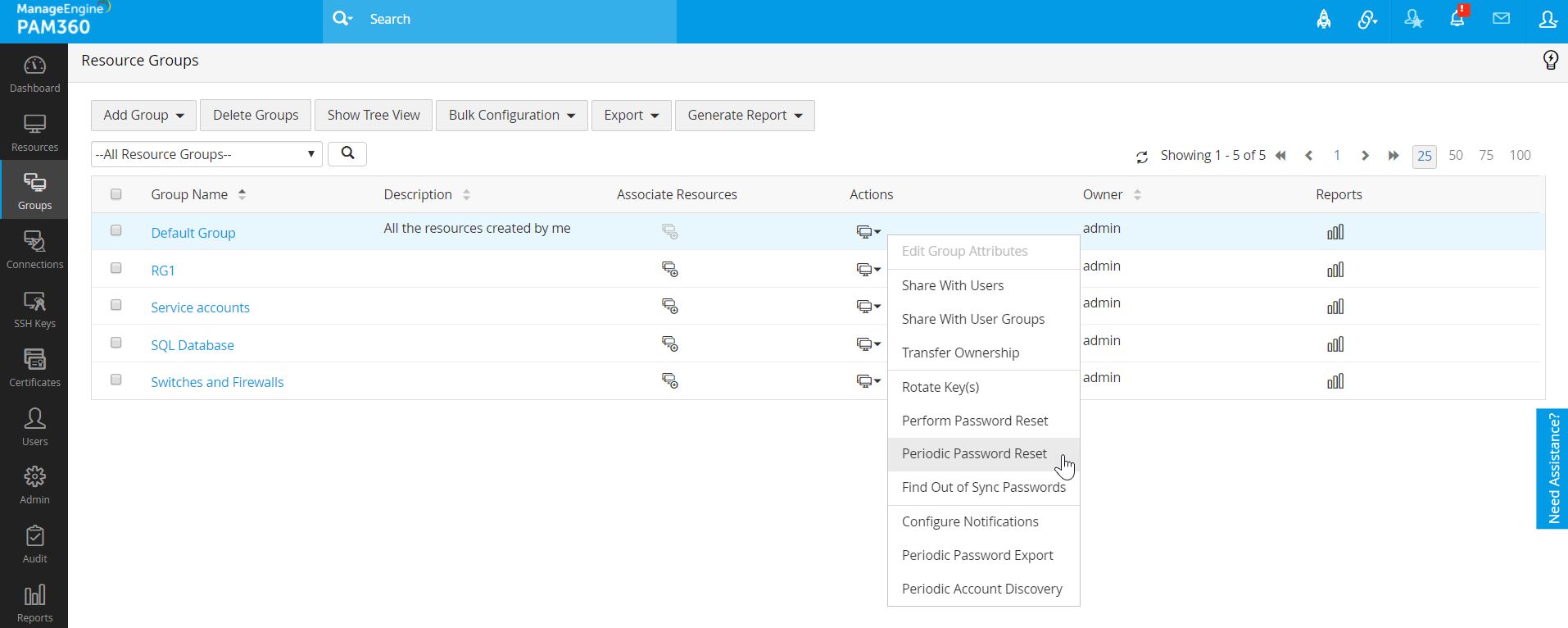- 左側のペインからグループタブをクリックします。[操作] >> [定期的なパスワードリセット]の順にクリックします。