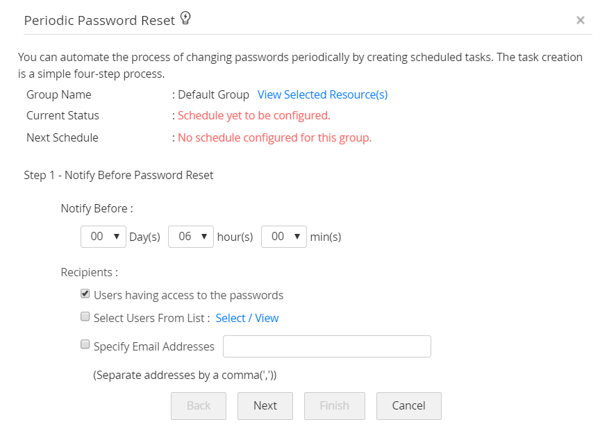 パスワードリセットの定期性の設定には、複数のオプションが利用できます。また、通知は、スケジュール設定されたタスク実行の各ステージで生成できます。さらに、パスワードリセット履歴は、PAM360でも保存できます。