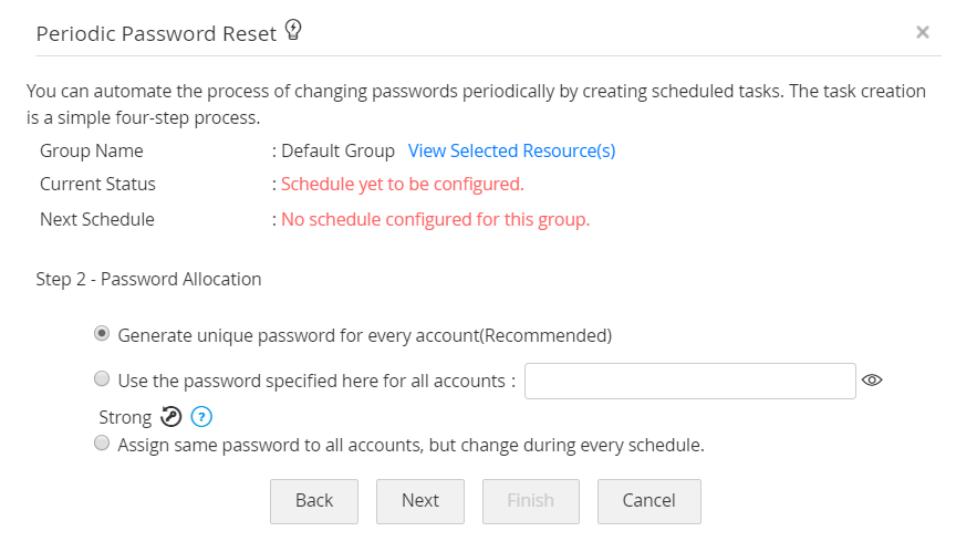 - また、同じパスワードをすべてのユーザーアカウントに割り当てることもできます。ただし、パスワードは、すべてのスケジュールに変更されることが条件です。このパスワードは、リソースグループ向けに設定されたパスワードポリシーに似ています。