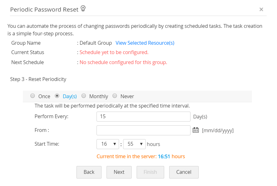 この手順では、パスワードリセットのスケジュールの実際の作成をしています。リセットは、一回のみ行うことができるようにするか、または定期間隔で繰り返すように設定することができます。