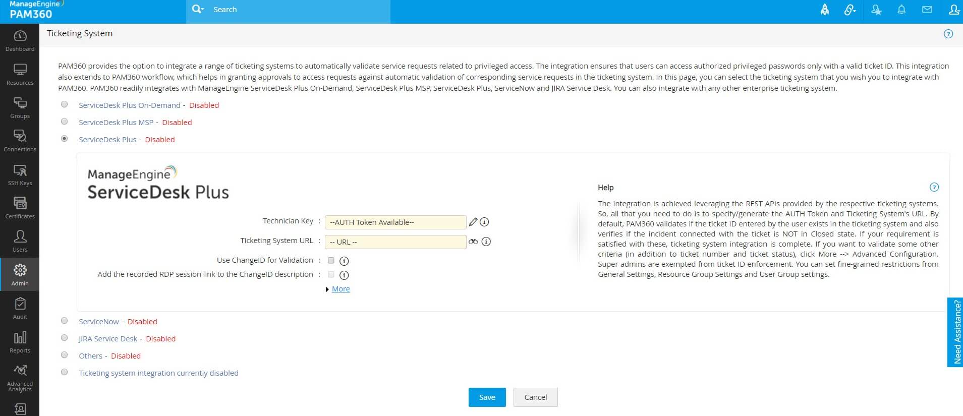 前提条件:CMDB統合のセットアップに進む前に、PAM360には、ServiceDesk Plusが実行されているサーバーの詳細と、技術担当者キーが必要です。