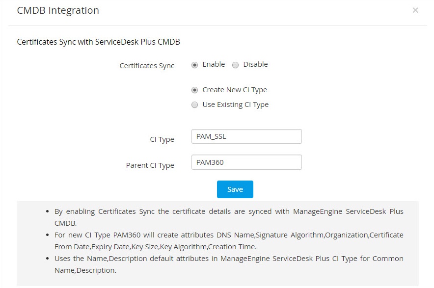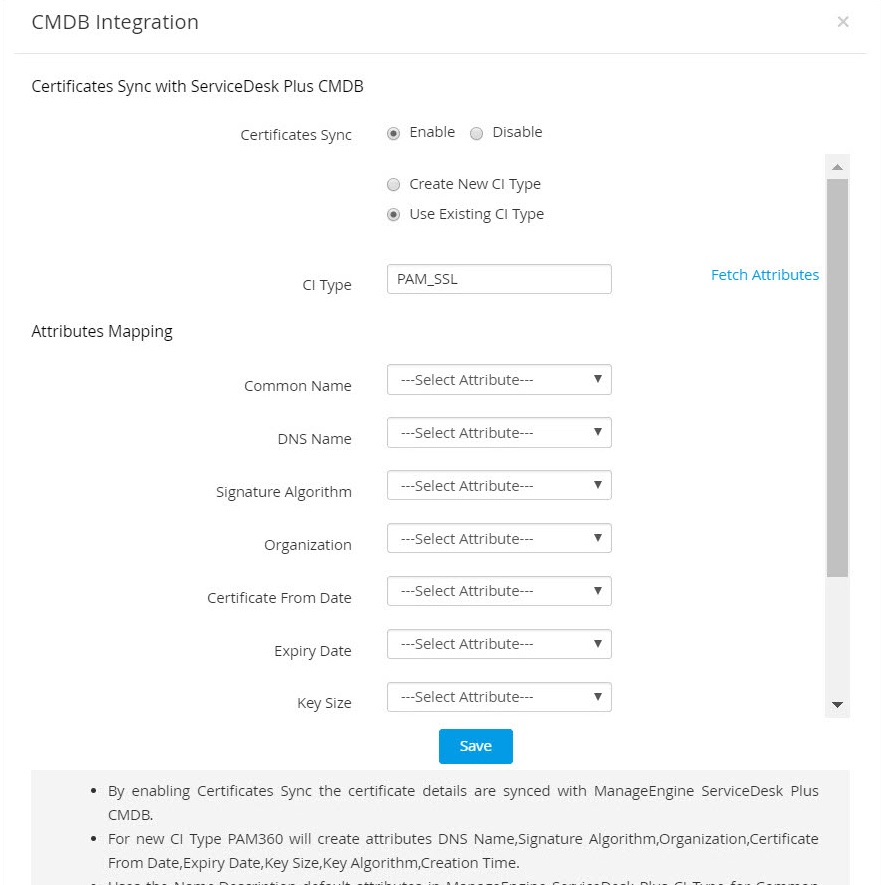 - [保存]をクリックします。新しいCIタイプが、以下の属性デイ構成されるSDPのCMDBに作成されます:コモンネーム、DNS名、署名アルゴリズム、組織、日付の証明書、有効期限日、キーサイズ、キーアルゴリズム、作成時間と説明。続いて、PAM360のリポジトリのすべてのSSL証明書は、SDPのCMDBにエクスポートされます。