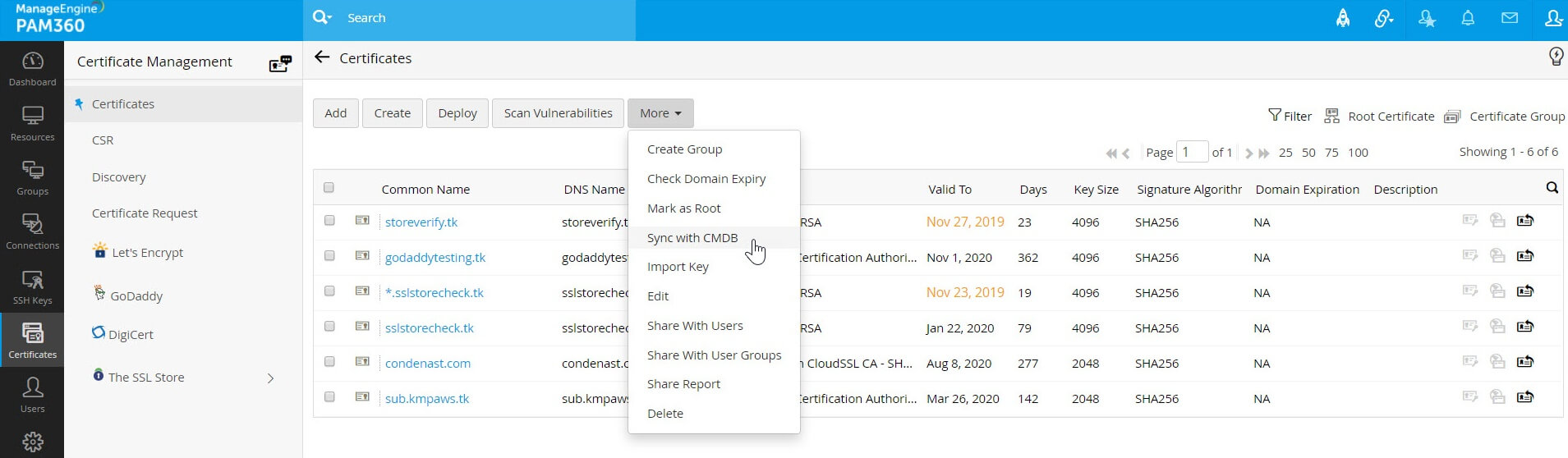 - [CMDBから同期]をドロップダウンメニューから選択します。PAM360のリポジトリのすべての証明書は、SDPのCMDBと同期化されます。