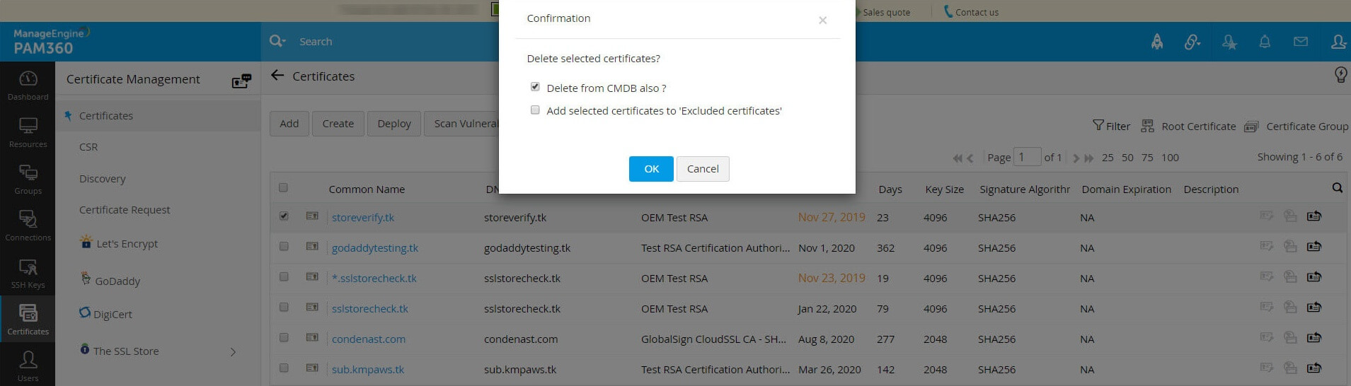 - チェックボックスを有効にして、[OK]をクリックします。 選択した証明shおは、PAM360とSDPのCMDBから削除されます。
