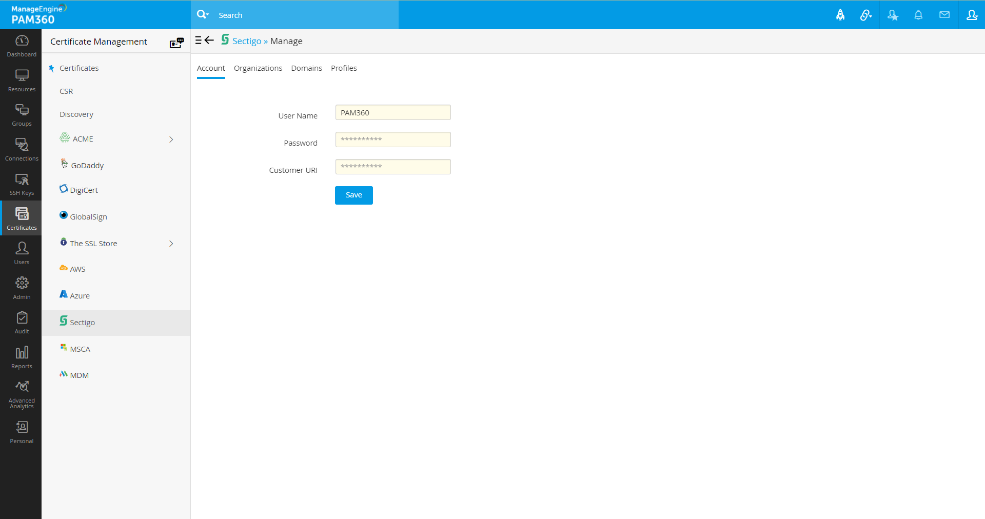 - PAM360で[証明書] >> [Sectigo]' タブの順に移動します。
