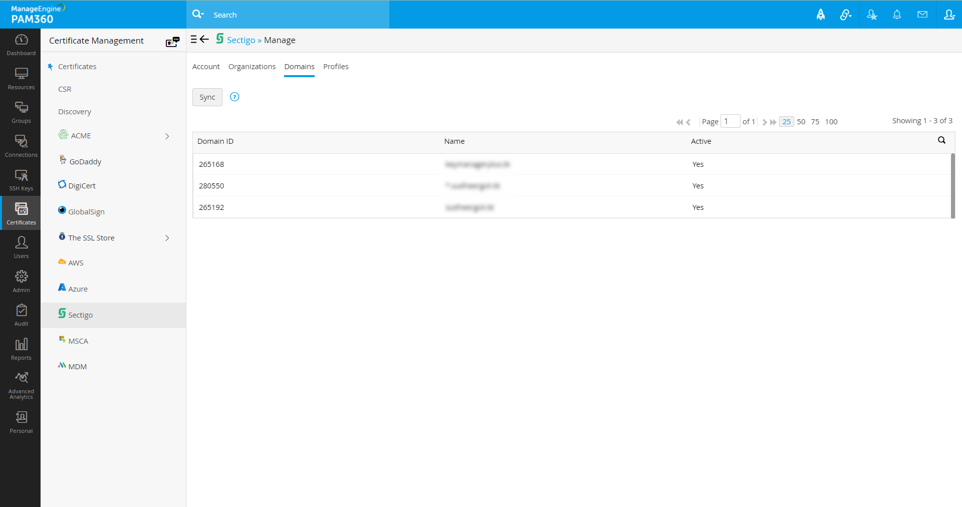 - 統合が完了うると、SCMアカウントに一覧表示されるすべての組織、ドメイン、および証明書プロファイルは、PAM360にインポートされ、IDとステータスとあわせて、個別タブの下に表示されます。この情報は、自動化されたスケジュールにより、週1回更新されます。お持ちのアカウントを手動で同期化するには、各タブにある[同期]オプションをクリックします。