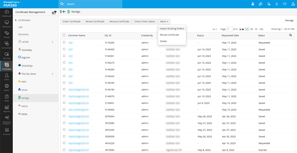 アクティブなSCM account,アカウントがある場合、Sectigo Certificate Managerを使って管理できる既存の証明書がある可能性があります。新しい証明書オーダーとは別に、すべての既存のオーダーをSCMポータルからインポートし、PAM360インターフェイスから管理できます。