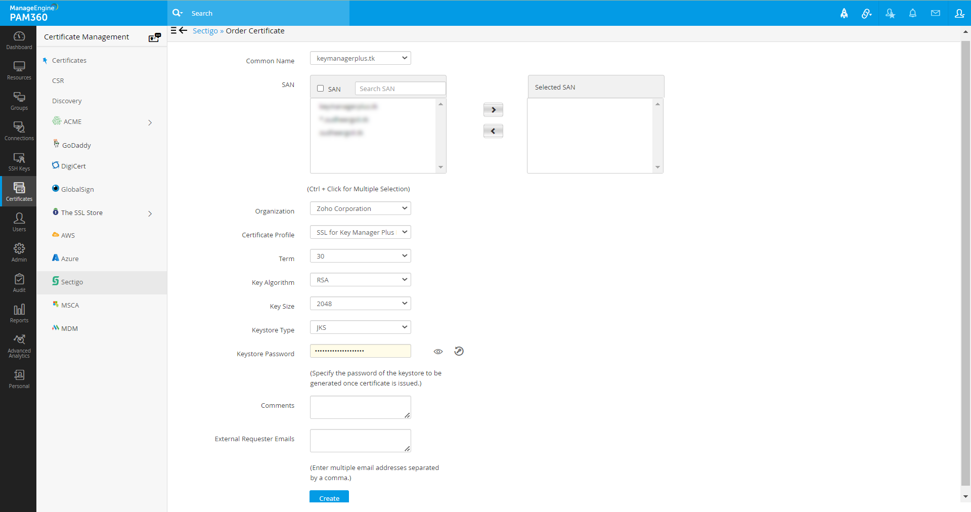 SCMアカウントがPAM360と正常にリンクされたら、PAM360から直接、新しい証明書オーダーの作成を開始できます。新しい証明書オーダーを実行するには:
