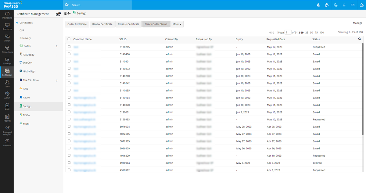 - PAM360 Webインターフェイスにログインし、[証明書] >> [Sectigo]の順に移動し、[管理]をクリックします。