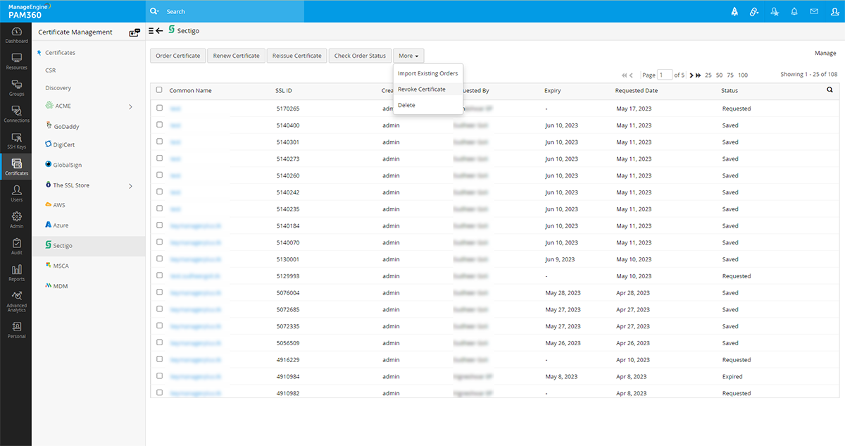 注記:削除オプションのみを使うと、証明書がPAM360インターフェイスから削除され、本製品から管理することができなくなりますので、注意してください。ただし、SCMから証明書要求は削除されません - 証明書はまだSCMポータルから表示および管理できます。