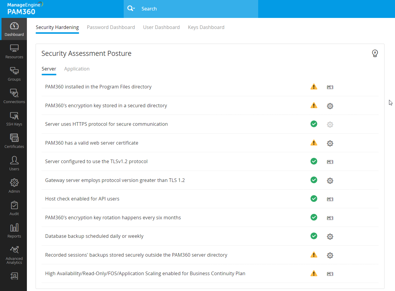 - アラートアイコン - サーバーとアプリケーション姿勢にあるアラートアイコンは、姿勢が、推奨されるPAM360慣行を満たしていないことを示します。アラートアイコンの横の[ギヤ]または[ヘルプマニュアル]アイコンをクリックして、必要な操作を実行し、PAM360環境のセキュリティスコアを上げ、強化します。