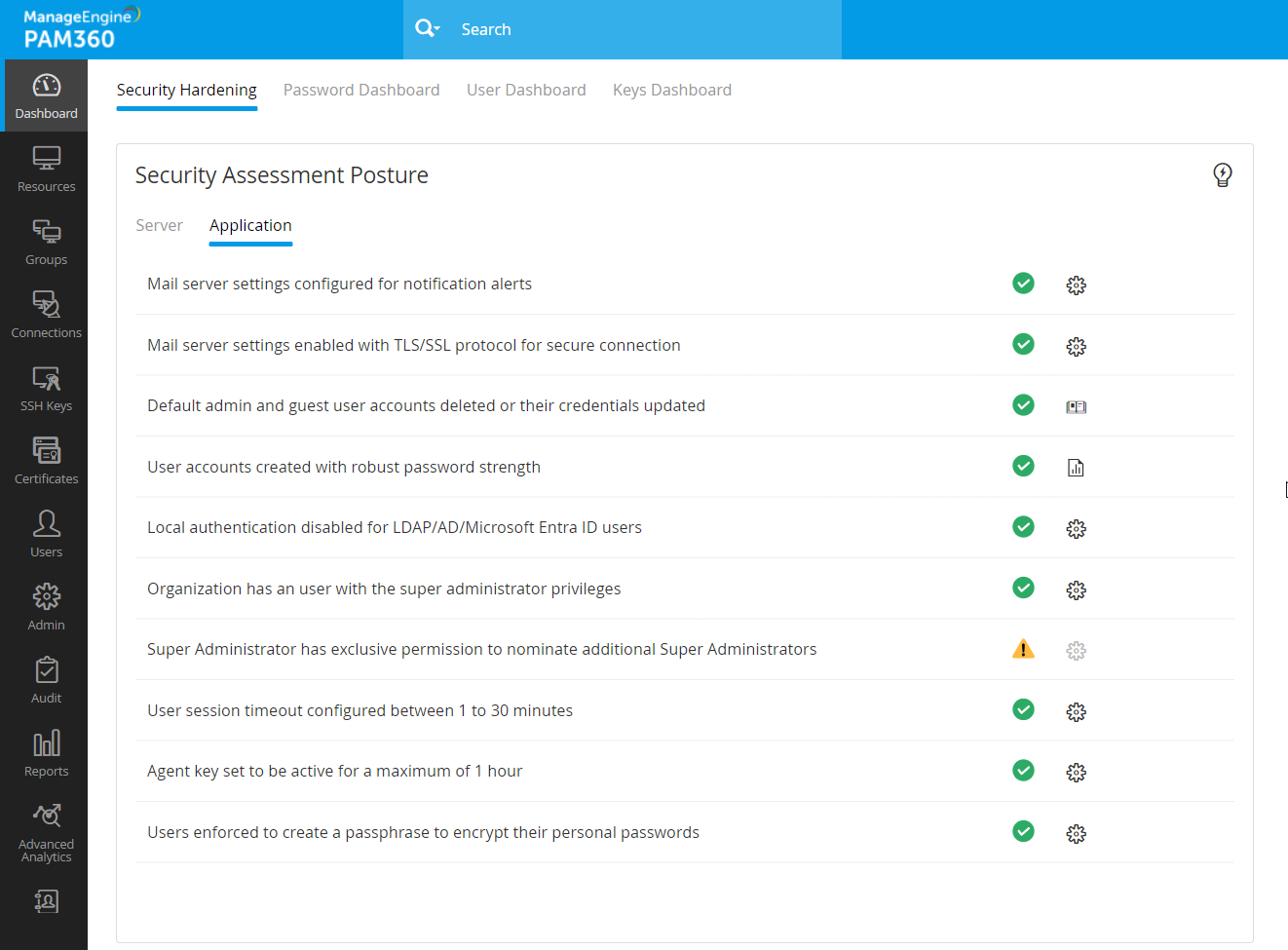 - ギヤアイコン - [ギヤ]アイコンをクリックすると、PAM360コンソール内の設定ページに転送されます。いくつかのケースでは、開いたダイアログボックスを使って、セキュリティ評価姿勢から設定を直接構成することができます。