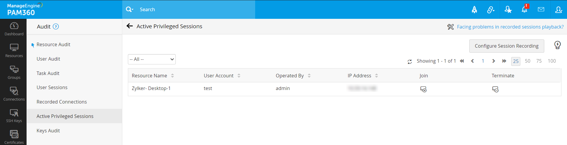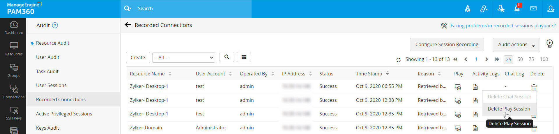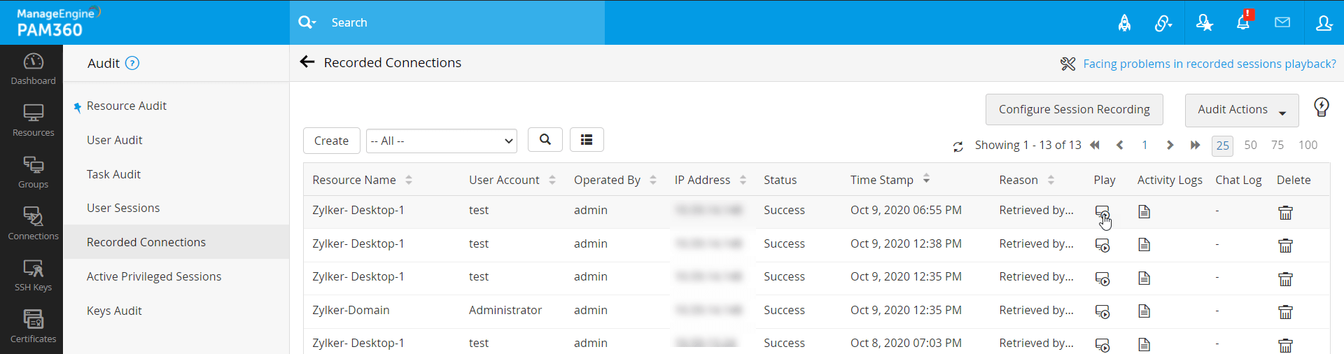下の手順にしたがって、PAM360インターフェイスの監査タブから、記録したセッションを表示します。リソース名、セッションを立ち上げたユーザー、またはセッションを立ち上げた時間等、詳細を使って、セッションを追跡することができます。