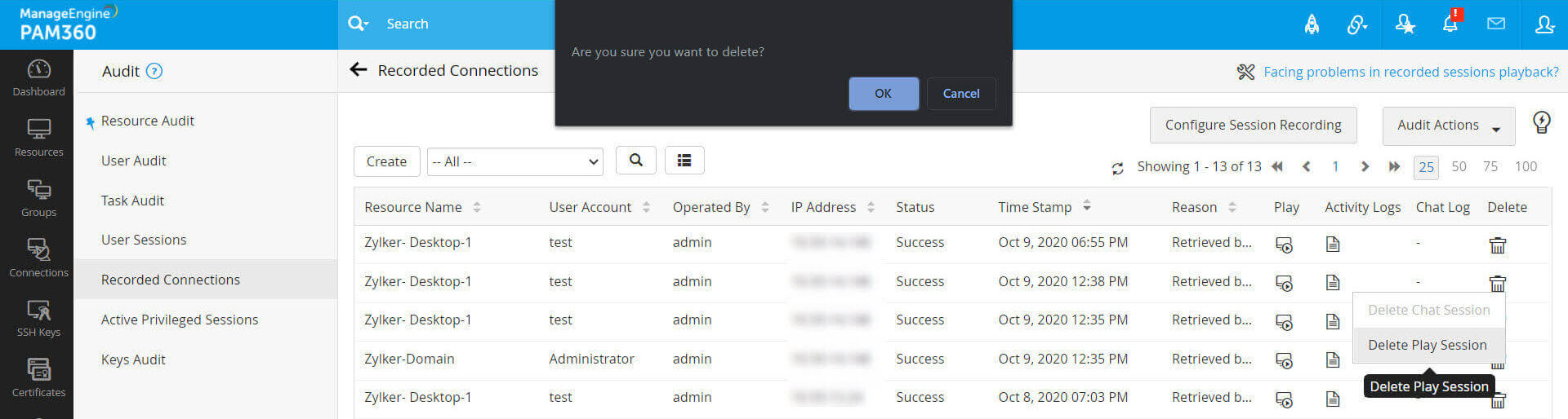 メモ:選択的セッションをPAM360データベースから削除するには、あなた自身を含む、少なくとも2人のアクティブ管理者が必要です。これは、適切な確認なしで、重要なセッションが削除されないようにするためです。