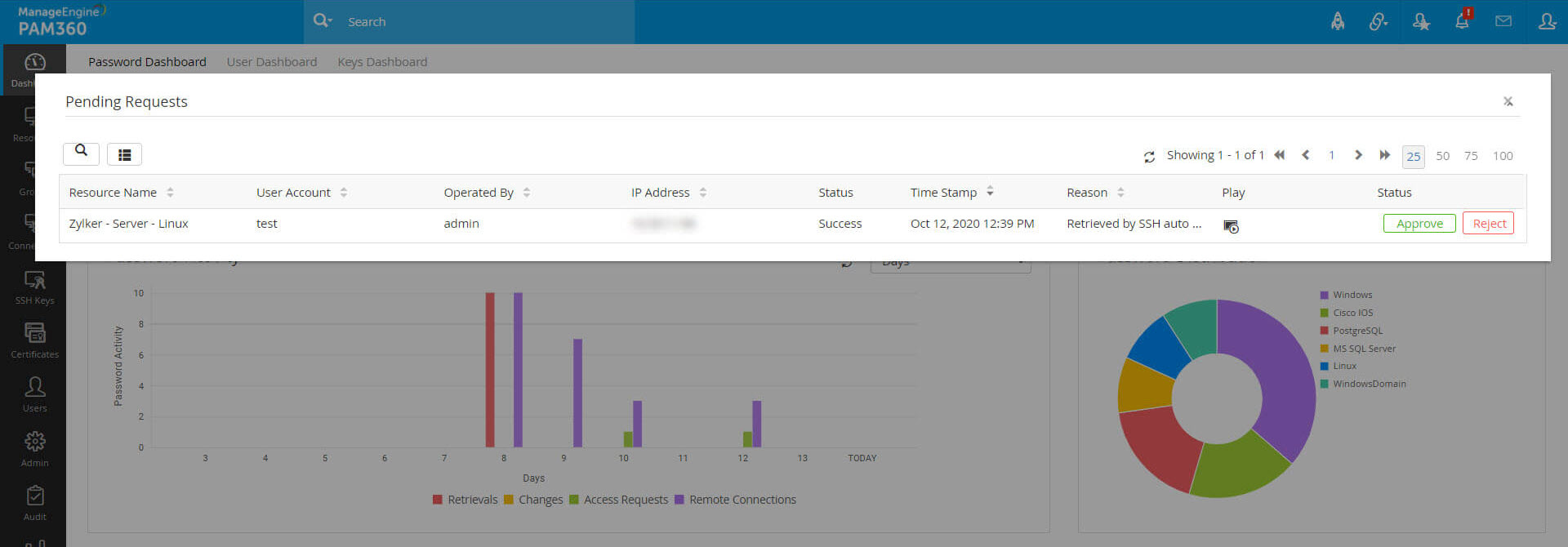 PAM360から起動した特権セッションを記録、再生、およびアーカイブ格納してフォレンジック監査をサポートし、特権セッション中に特権アカウントが実行したすべての操作をエンタープライズが監視することができます。セッション記録は、アクティビティの先行監視が必須な組織の監査およびコンプライアンス要件に対応することで、管理者は、特権アクセスを「誰が」、「何を」および「いつ」したかの質問にすぐに答えます。PAM360を使って、PAM360インターフェイスから起動したWindows RDP、SSH/Telnet、およびSQLセッションを記録できます。