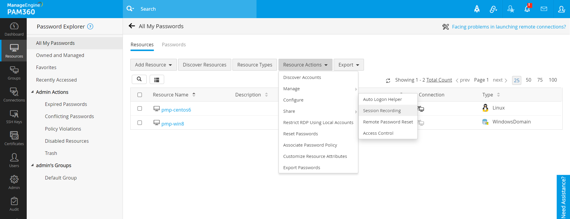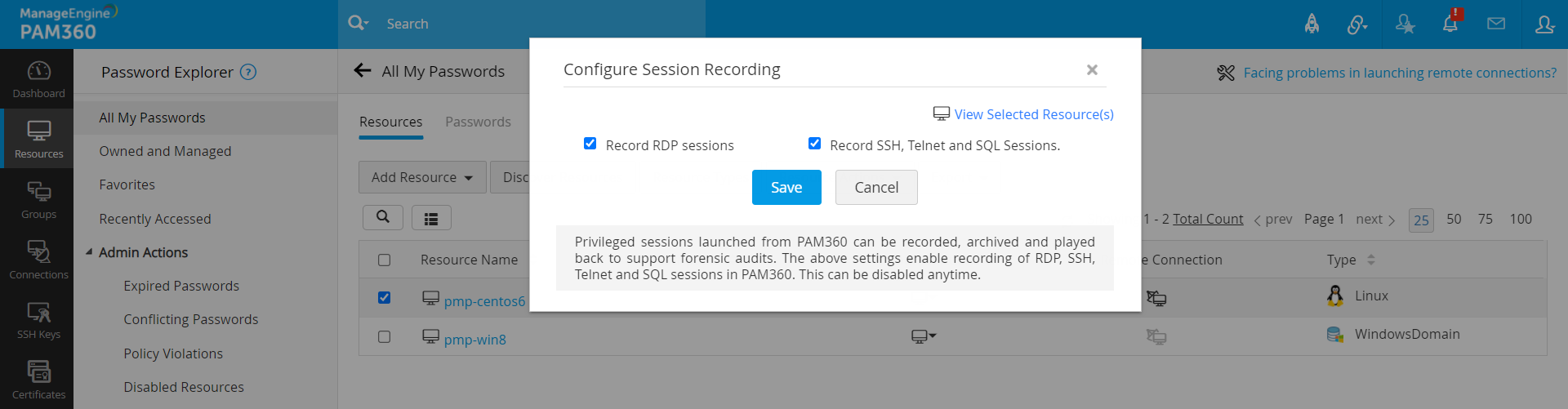 - これで、セッション記録機能は、これらのリモート端末セッションタイプ(RDP、SSH、Telnet)の1つをサポートするリソースを管理者が追加するとすぐに、利用できるようになります。