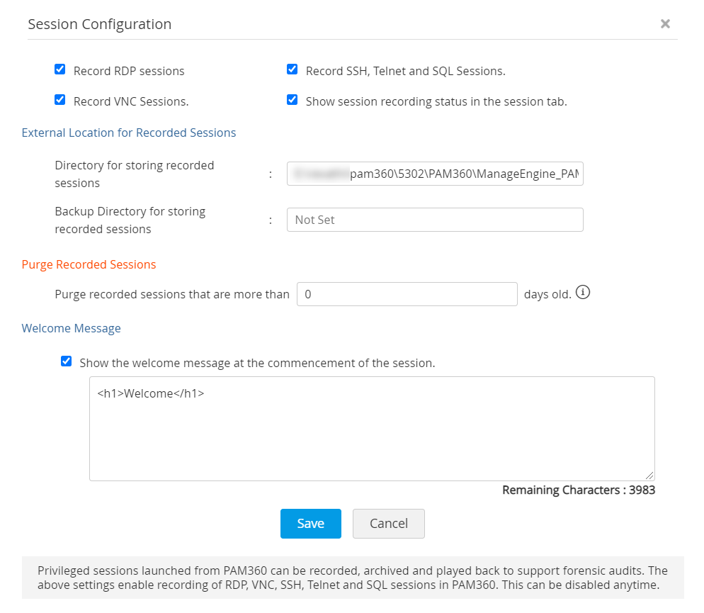 メモ:記録はデフォルトでは、パス<PAM360_Install_Directory\PAM360\recorded_files>に保存されます。記録を保存するこの外部の場所は、[管理者] >> [構成] >> [セッション記録]の順に移動し、いつでも変更できます。