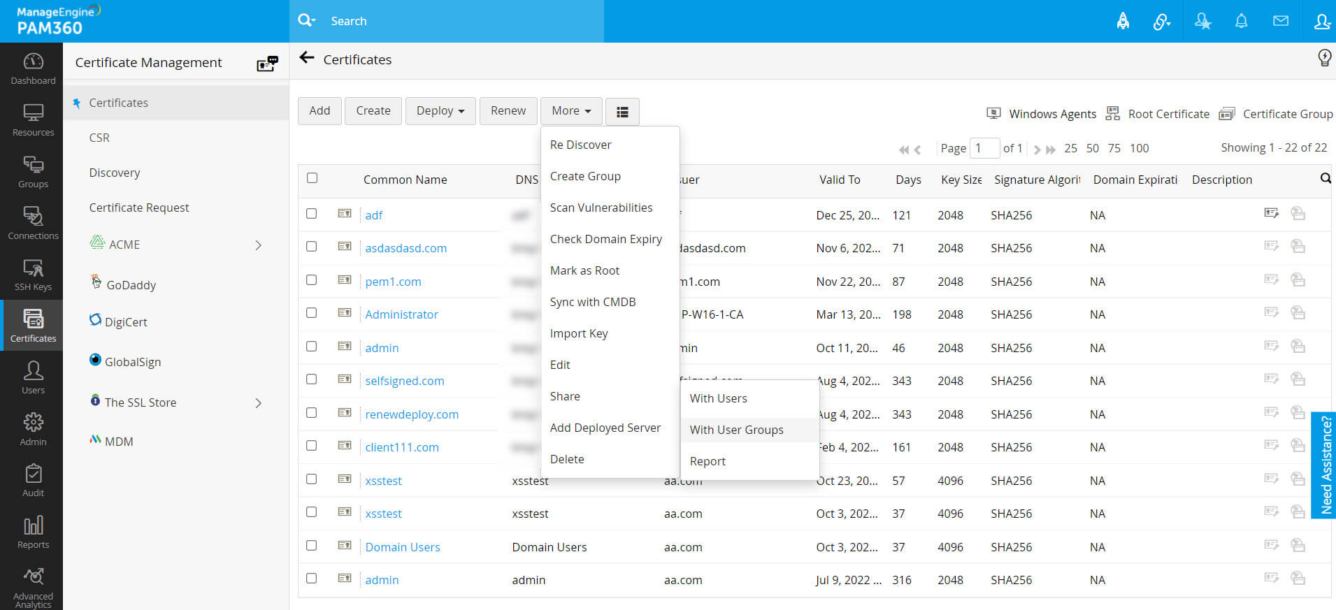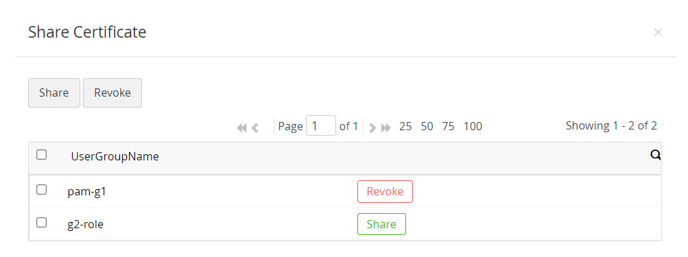 PAM360では、証明書または証明書グループをユーザーおよびユーザーグループと共有できます。証明書を共有すると、その証明書のすべての詳細が自然に共有されます。一般に、すべてのユーザーは、自分が所有する証明書と、共有されている証明書にアクセスできます。