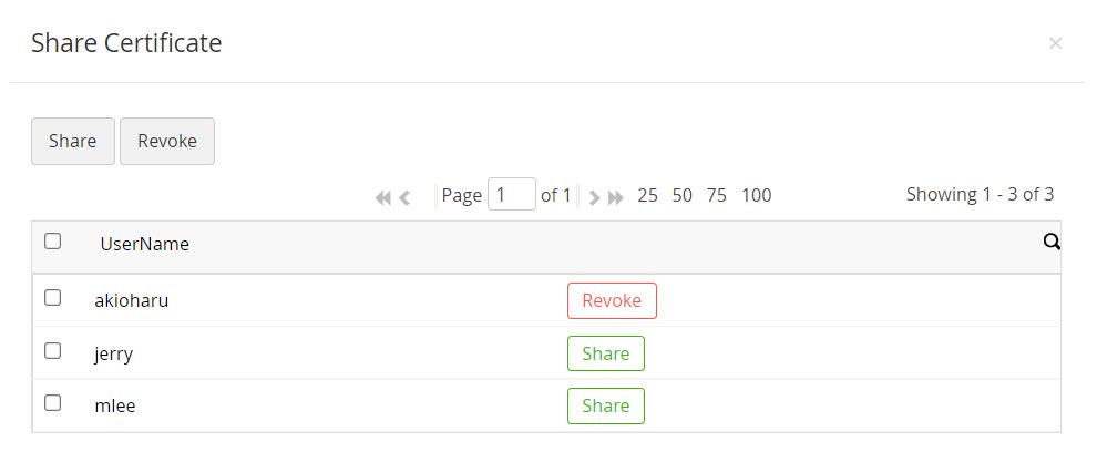 - 開いた新しいウィンドウで、証明書を共有するユーザーまたはユーザーグループを選択し、[共有]をクリックします。共有したら、証明書へのアクセスを、同じウインドウからいつでも取り消すことができます。