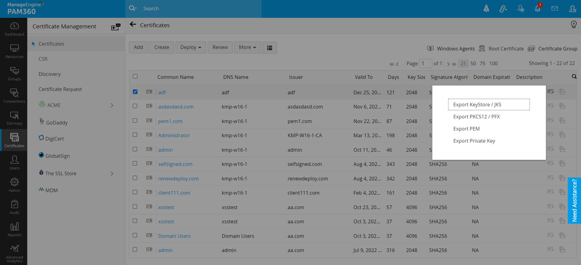 - 秘密キーをエクスポートするには、[証明書]に移動し、共有証明書を選択して、証明書の横にある[キーストア]アイコンから[秘密キーをエクスポート]をクリックします。