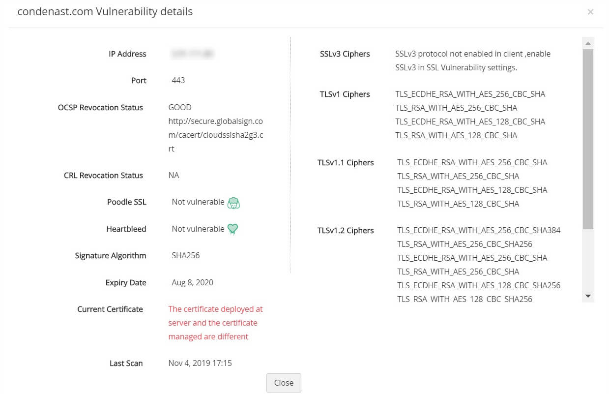 - お使いのドメインサーバーをスキャンし、HEARTBLEEDおよびPOODLEの脆弱性がないか確認し、続いて、CRLおよびOCSP取消ステータスを確認します。