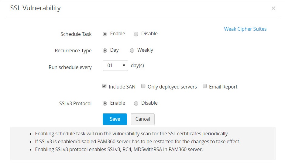 - SSL 3.0プロトコルのドメインサーバーでのスキャンを有効にするには、有効化オプションを選択して、 PAM360 Serverで同内容を有効にします。
