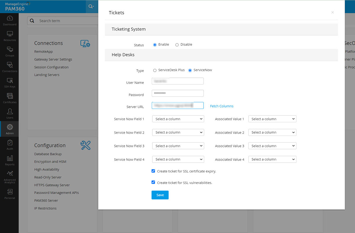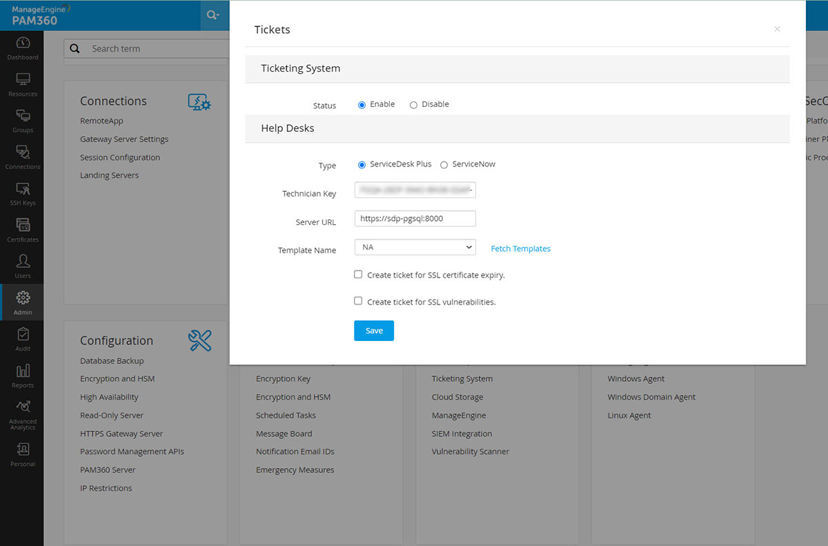 SSL証明書用の発券システムを有効にするには、発券システムがPAM360で実行されているマシンのサーバーURLを入力し、発券システムホストにPAM360 Serverがアクセスできることを確認します。