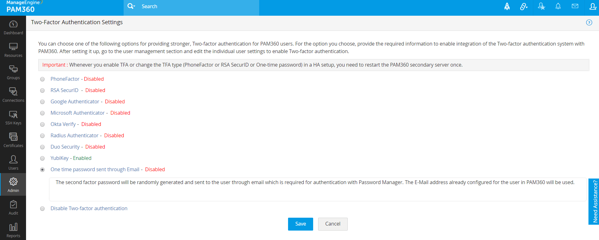 TFAを有効にするか、TFAの種類(PhoneFactor、RSA SecurID、ワンタイムパスワード、RADIUS、またはDuo)を変更するたびに、さらに高可用性を構成している場合は、PAM360セカンダリサーバーを一度再起動する必要があります。