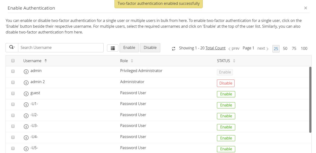 - 単一ユーザーまたは複数ユーザーは一括で、二要素認証を有効または無効にできます。単一ユーザーに二要素認証を有効にするには、各ユーザー名の横にある[有効化]ボタンをクリックします。複数ユーザーの場合は、必要なユーザー名を選択し、ユーザーリスト上部の[有効化]をクリックします。同様に、ここからTFAを無効化することもできます。