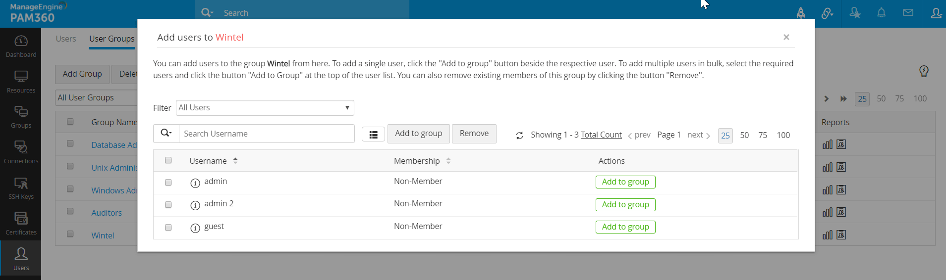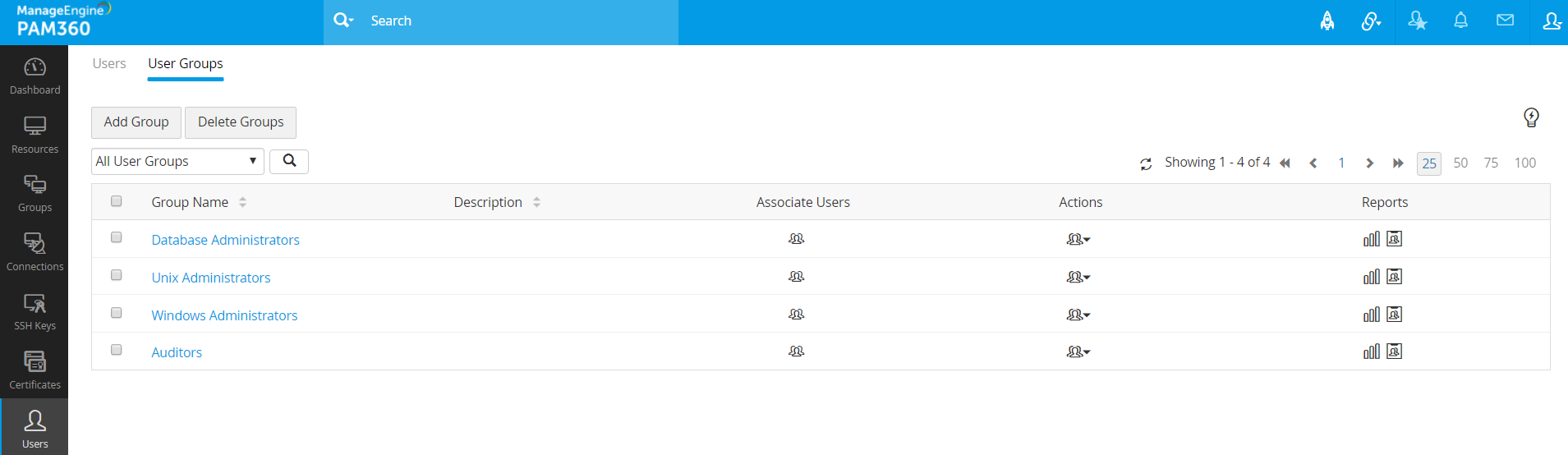 ユーザーは、PAM360で管理しやすいようにグループ分けできます。ユーザーのグループ分けにより、そのグループのすべてのリソースで、操作を一括で実行できます。PAM360に追加されたリソースは、各ユーザーを個別に選択するのではなく、ユーザーグループに簡単に割り当てることができます。