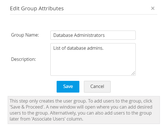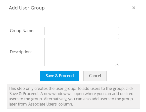 - 表示されるポップアップで、ユーザーグループに名前と説明を入力します。