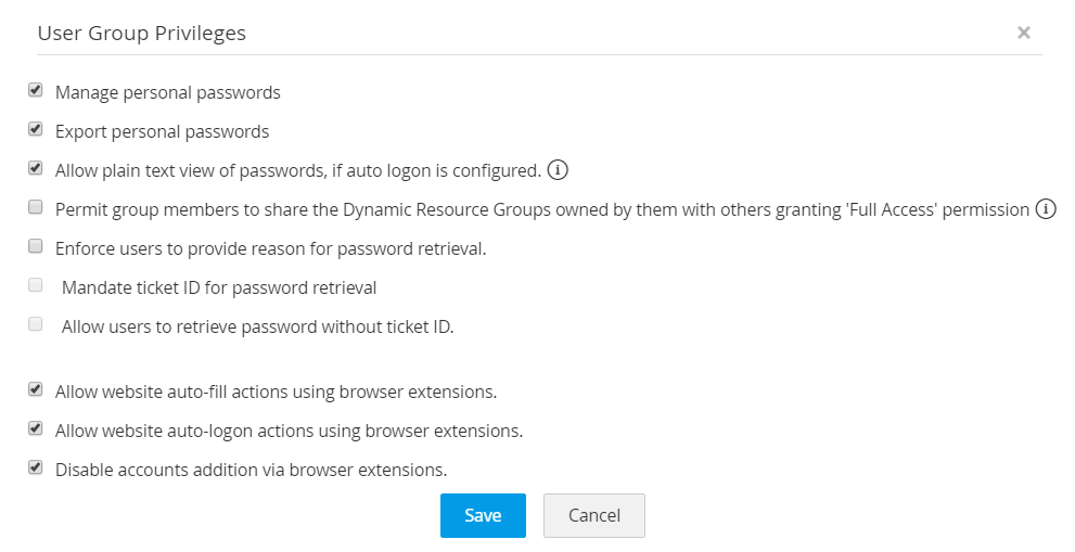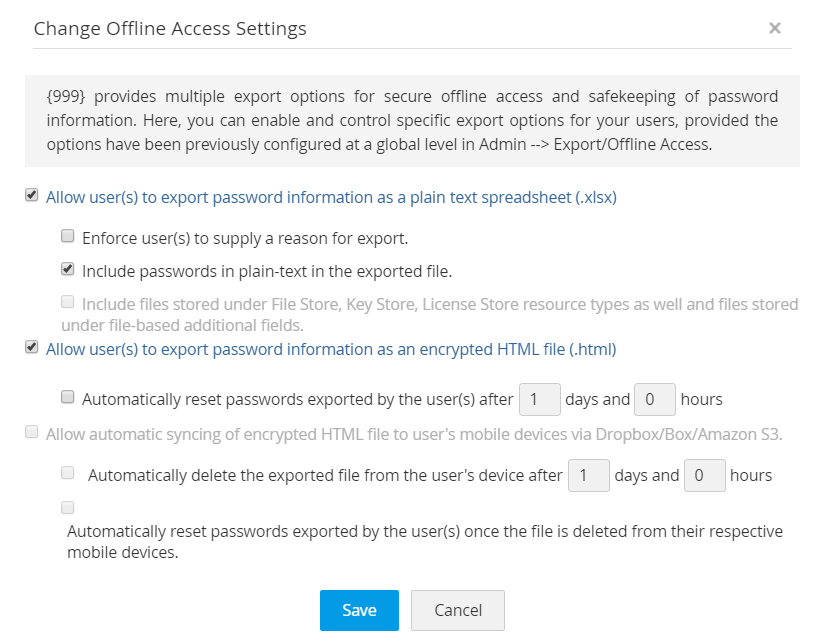 - 個人パスワードをエクスポート:このオプションを有効にすると、そのグループのユーザーは、個人タブに保存した個人パスワードをエクスポートできます。特定のユーザーグループへのパスワードエクスポートを許可しない場合は、このオプションの選択は解除します。
