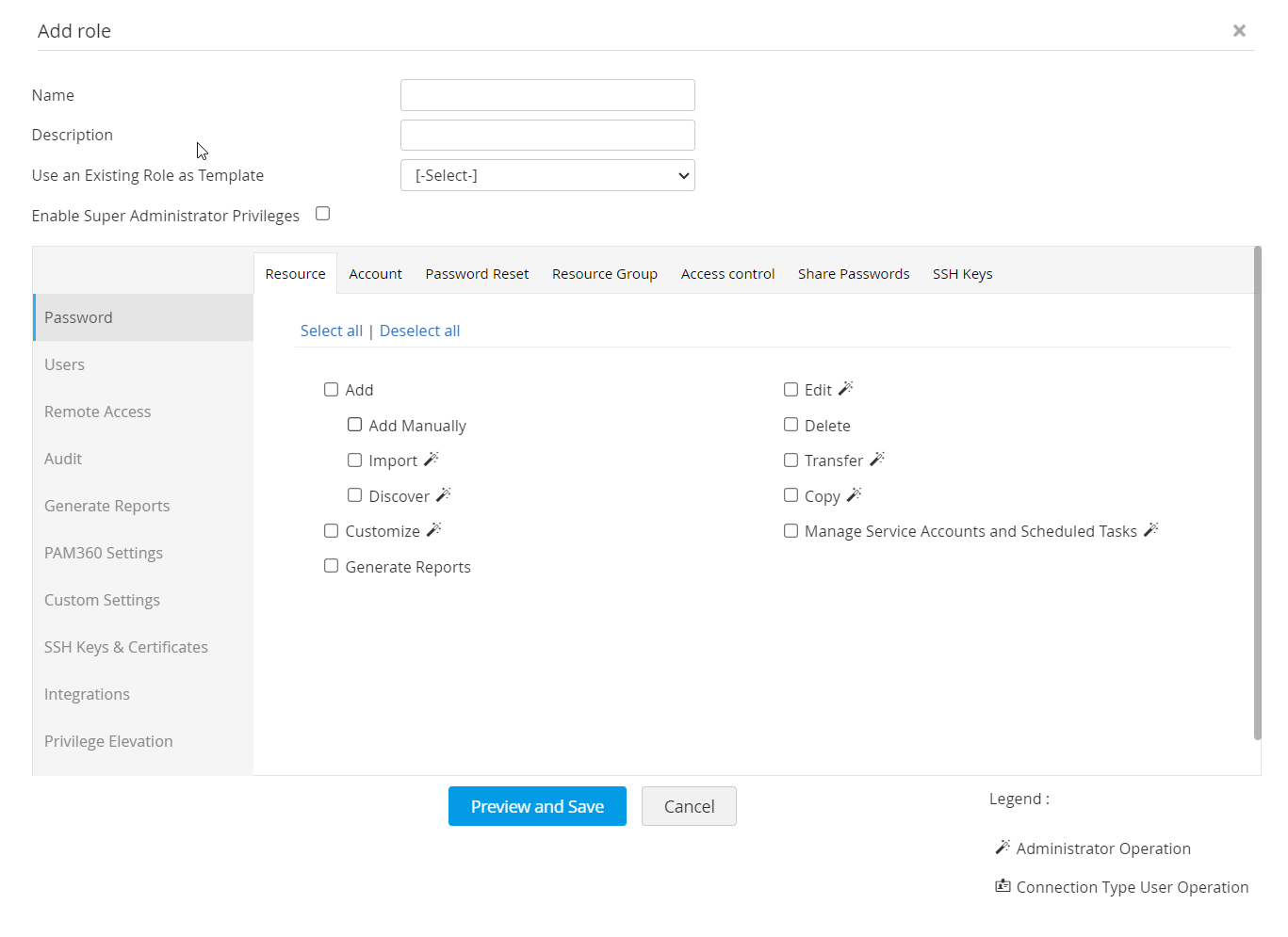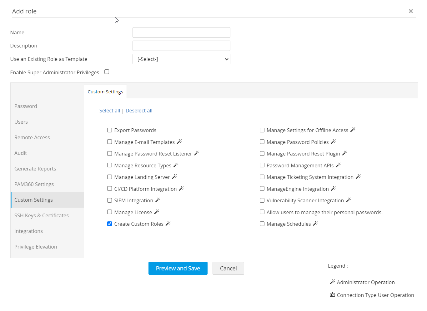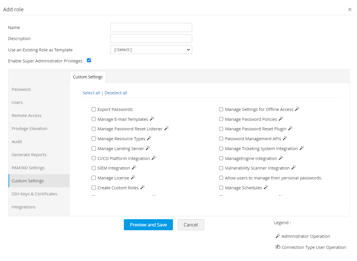 魔法の杖の後のオプションは、管理者の操作の資格があるものを指します。これらの杖のマークが付いた操作の1つで作成したカスタムロールは、管理者に等しいロールとみなされます。杖マークが付いた操作で。必要な分のカスタムロールが作成できますが、ロールは、PAM360のユーザーに割り当てられたときにのみ、ライセンスについてカウントされます。例えば、ライセンス付与により10管理者を持つことができ、杖マークが付いた操作が1つ以上あるカスタムロールがある場合、このロールをユーザーに割り当てると、PAM360インストールに割り当てられた10ライセンスのうち1としてカウントされます。