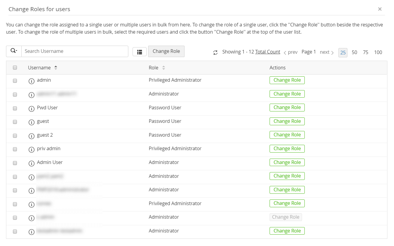 - 開いた新しいGUIウインドウで、個別ロールに属するすべてのユーザーのリストを初めに表示する場合、テーブル上のフィルターを使って、そのロールを選択します。そのロールに関連づけられたユーザーが表示されます。ロールの変更が必要なユーザーを選択します。