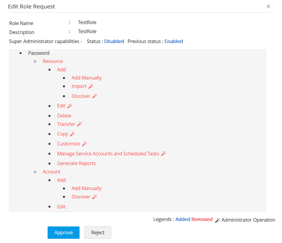 - カスタムロールを編集/修正するには、特定ロールの横の[編集]アイコンをクリックし、必要な変更を実行します。続いて、[プレビューと保存]をクリックします。編集内容を検証して、[保存]をクリックします。ロールを適用する前に、編集内容も、別の管理者による承認待ちのキューに入ります。ロールの編集の承認待ちは、個別ロールの横にある[承認待ち]オプションをクリックして表示できます。下の画像で、赤色はロールから削除された操作、また青色はロールに追加された操作を指します。