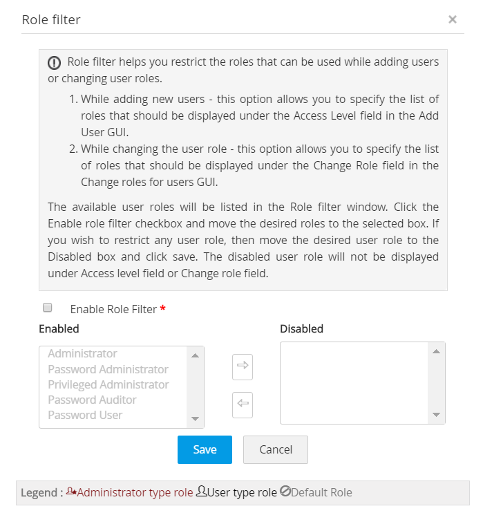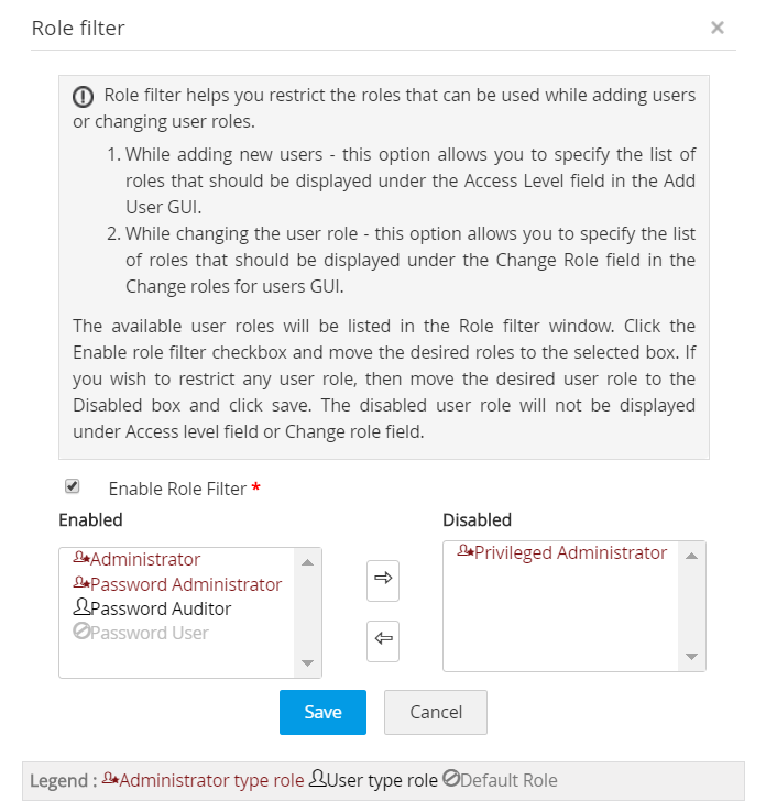 ロールフィルターオプションで、ユーザー追加GUIのアクセスレベルフィールドに表示されるロールのリストを選択できます。ロールフィルターを使って、新しく追加された、またはロールを変更されたユーザーに割当が必要なロールを制限できます。