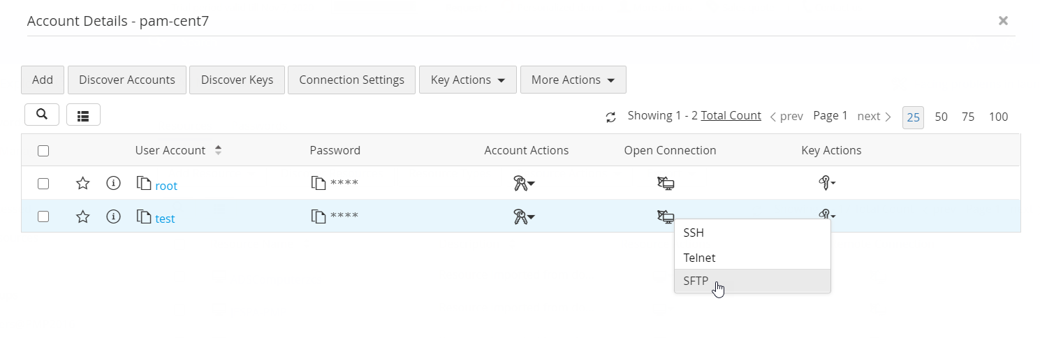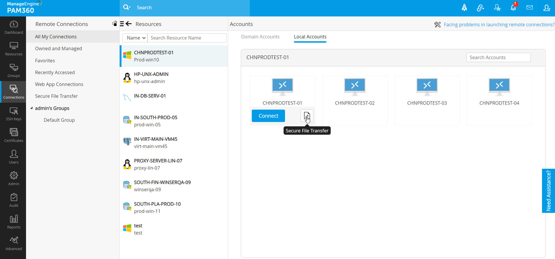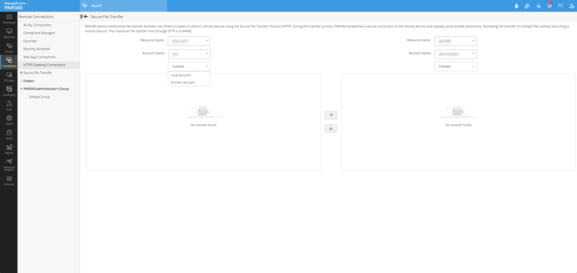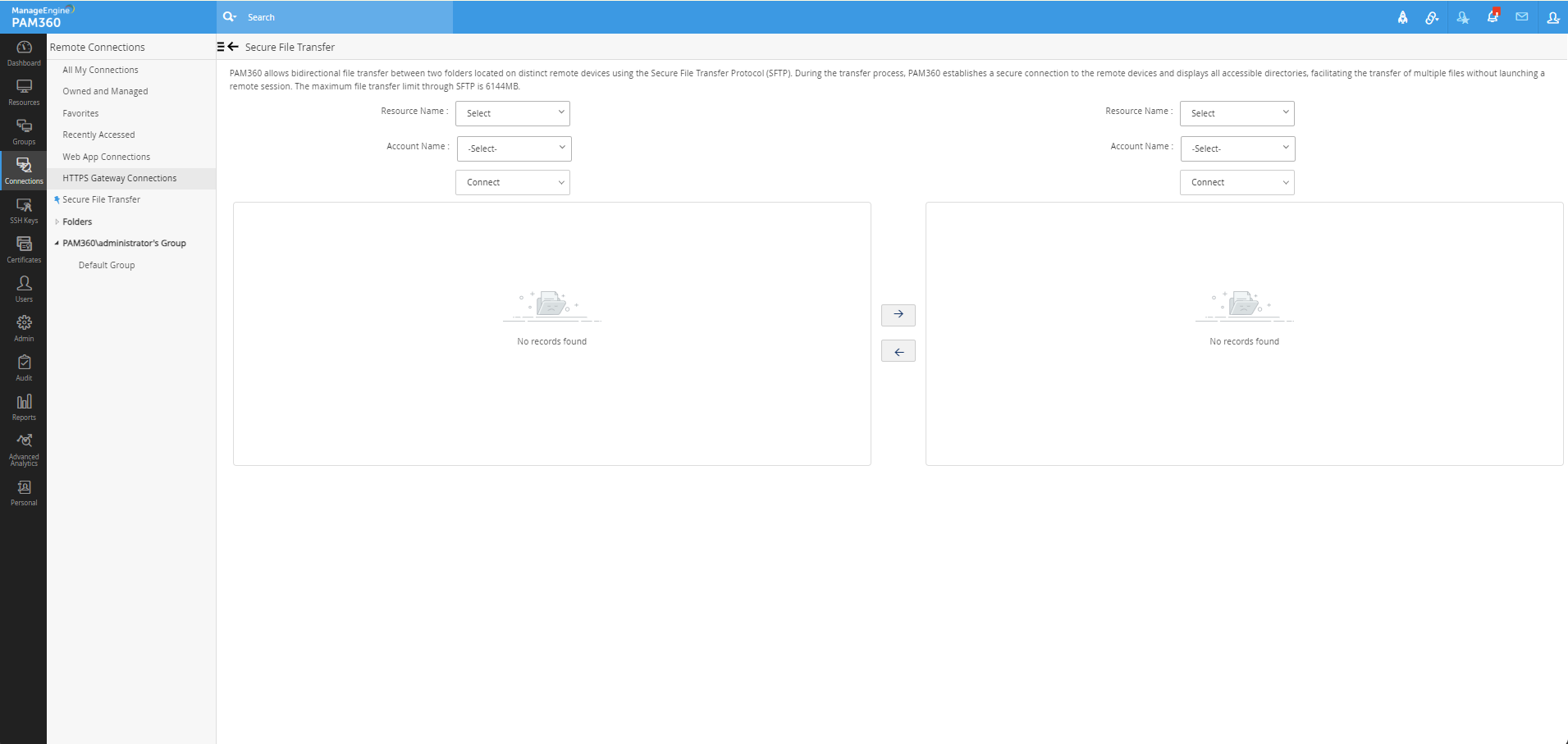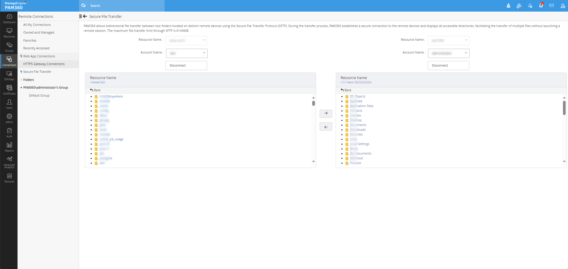 PAM360 Webインターフェイスは、個別リモートシステムにあるフォルダの間で、Secure File Transfer Protocol(SFTP)を使ったファイルの双方向転送をサポートしています。下の手順にしたがって、ファイル転送を開始します。
