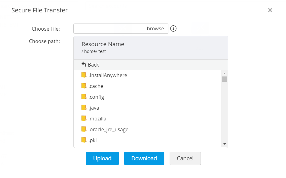 - セキュアファイル転送ダイアログボックスが開き、ここで、PAM360が接続を認証し、そのシステムのすべてのディレクトリが[パスを選択]セクションに一覧表示されます。