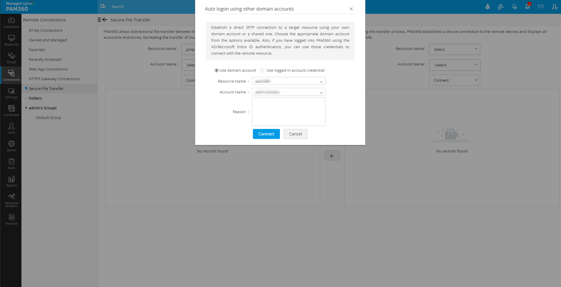 - リソース名とアカウント名ドロップダウンを使って、ドメインアカウント認証情報を選択し、[接続]をクリックし、選択した認証情報を使って直接SFTP接続を確立します。