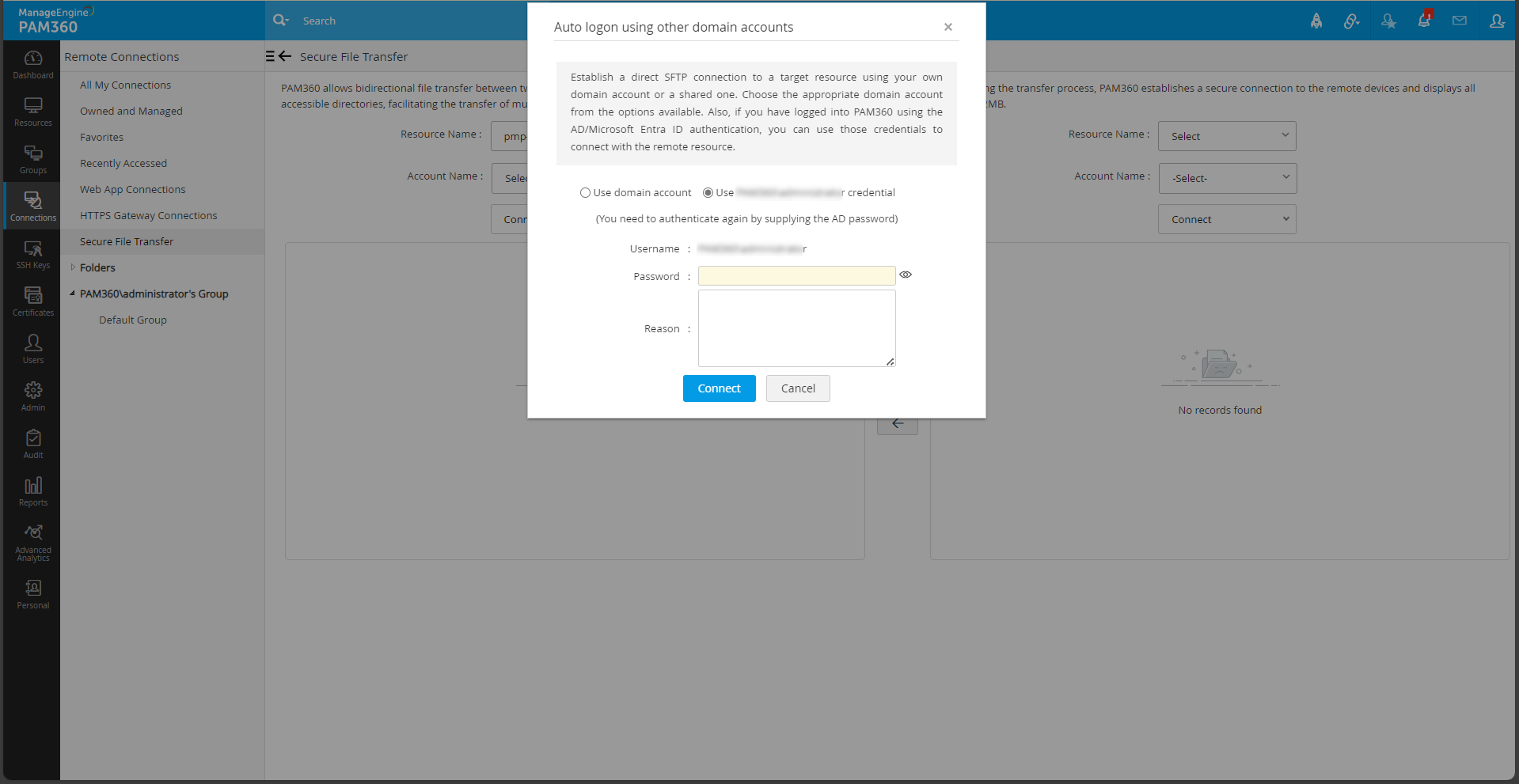 - PAM360にAD/Azure AD認証を使ってログインした場合、ログインしたアカウント認証情報を使って、リモートリソースに接続するオプションがあります。