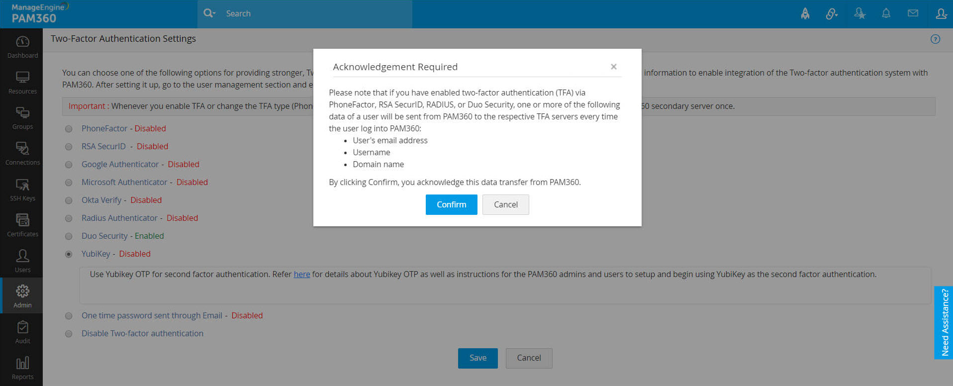 - [確認]をクリックして、YubiKey 二要素認証を有効にします。