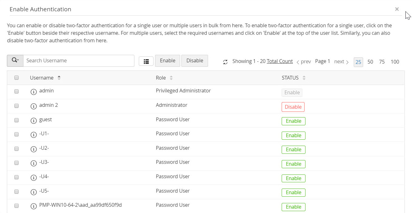 - ポップアップウインドウで、YubiKey二要素認証の実行が必要なユーザーを[有効化]をクリックして選択します。