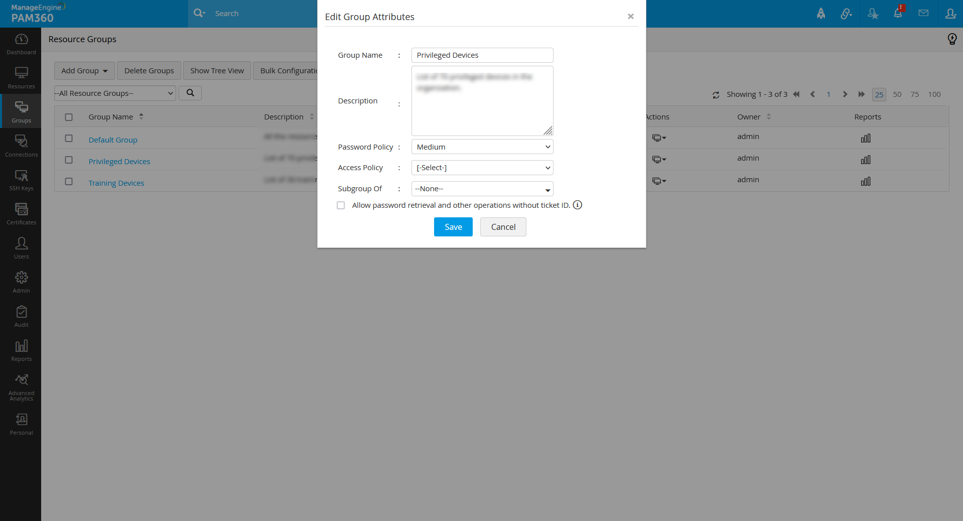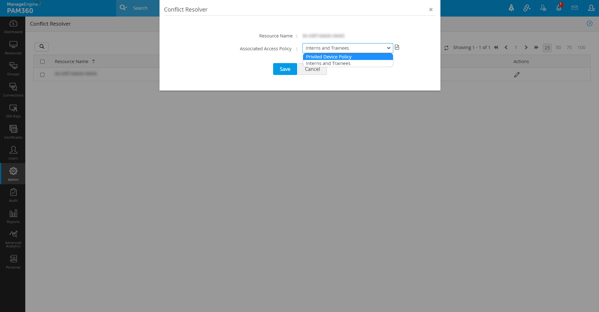 スタティックリソースグループ「特権デバイス」と「共有デバイス」'でグループ分けされたリソース「pam-server-1」を考えます。初めに、 「特権デバイス」は、アクセスポリシー「正規従業員」と関連づけられ、また後で、「共有デバイス」は、「契約従業員」と関連づけられました。
