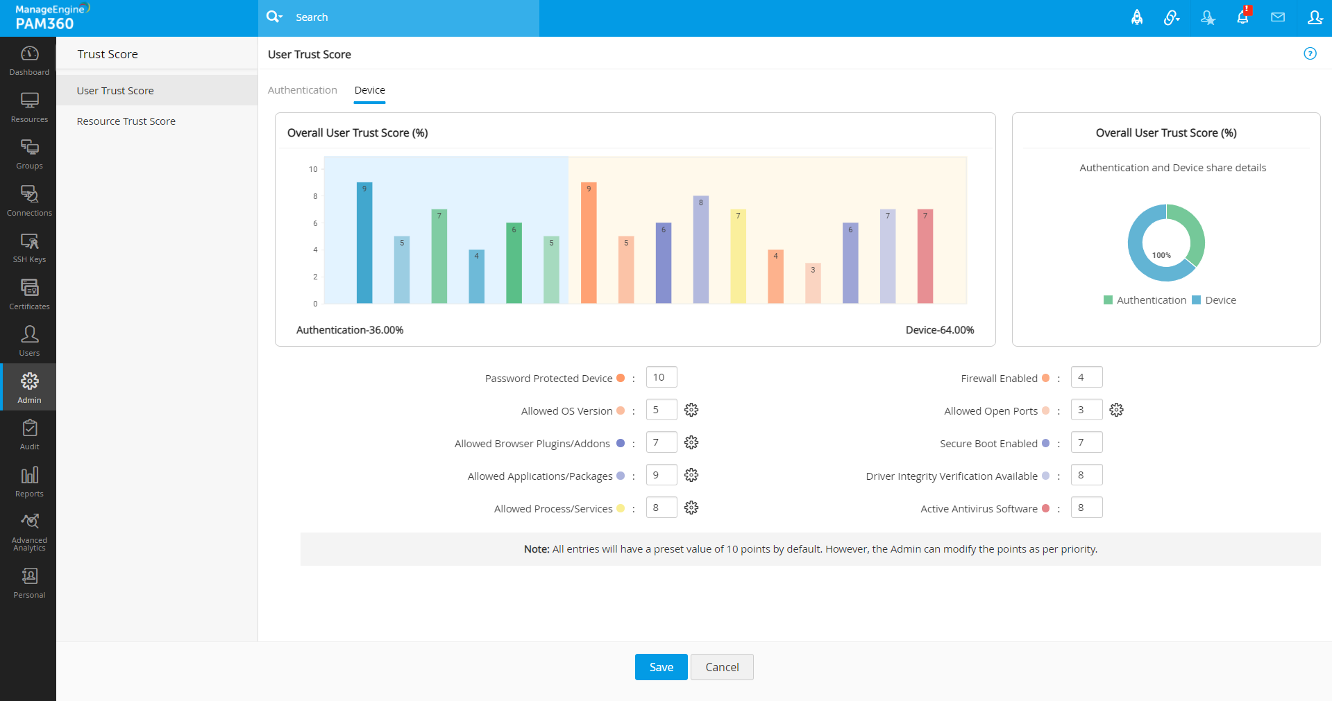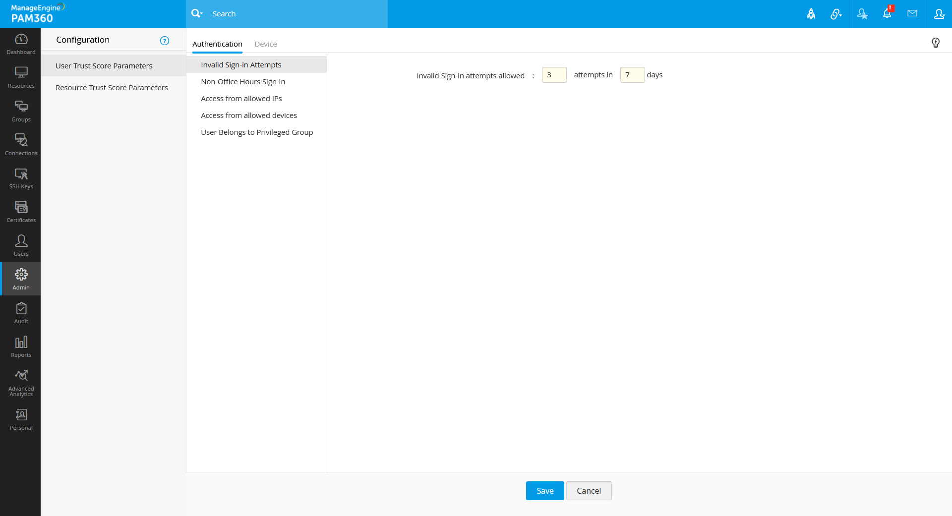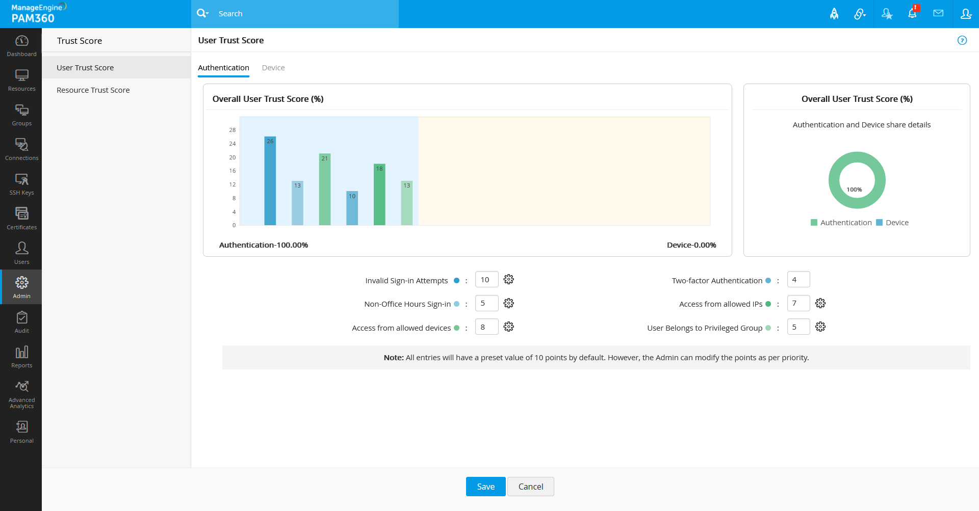 - ユーザー認証パラメーターは、PAM360監査から計算されます。監査データがパージされた場合、ユーザー認証は、固定パラメーターの重み付けにより影響を受ける可能性があります。