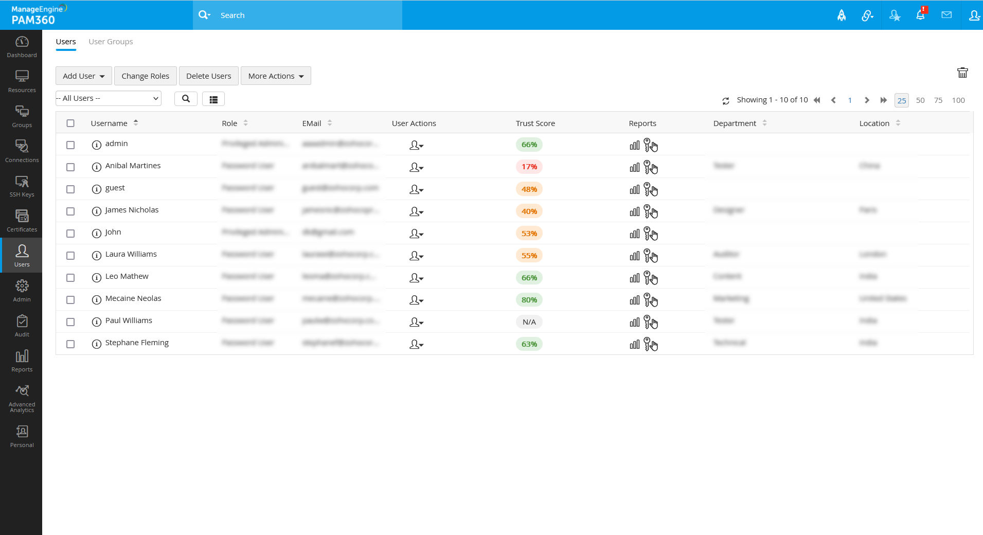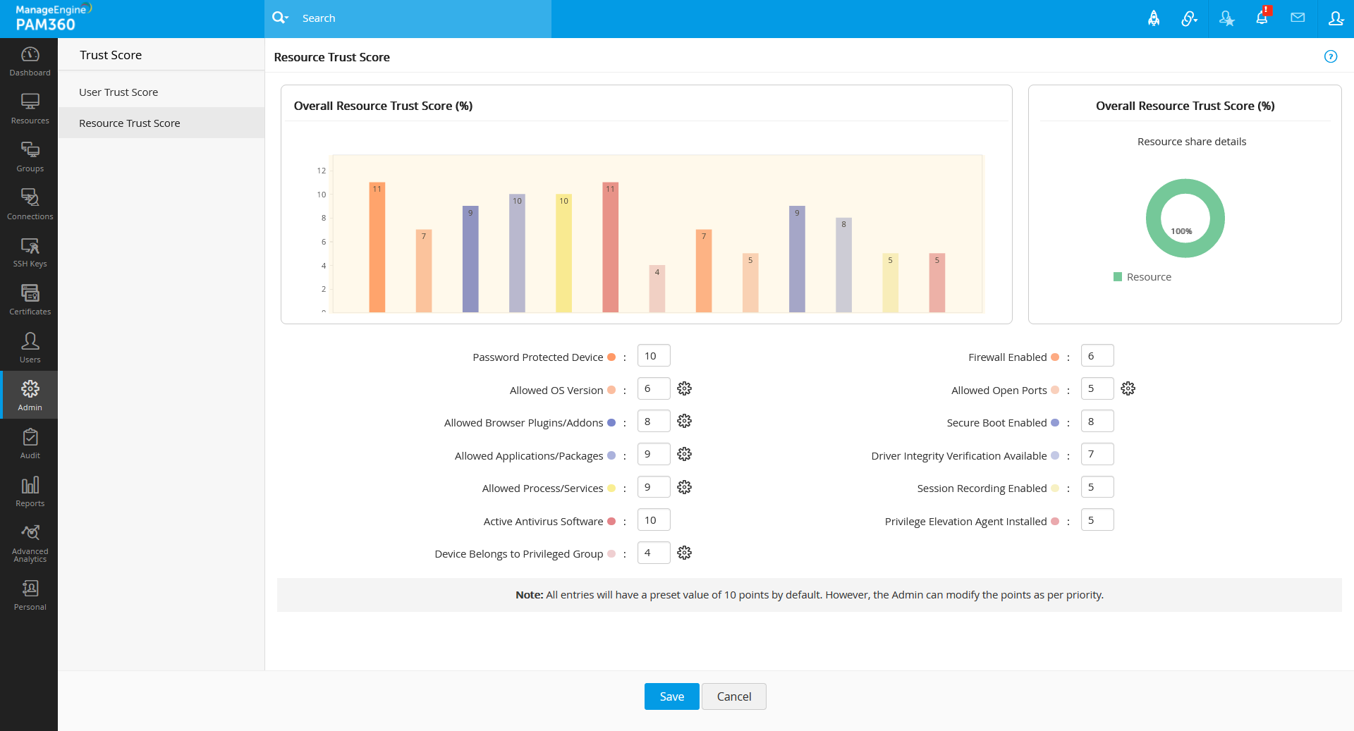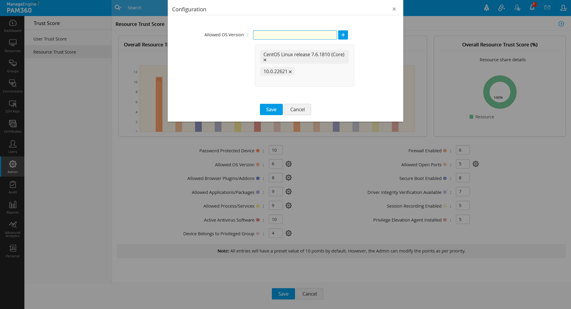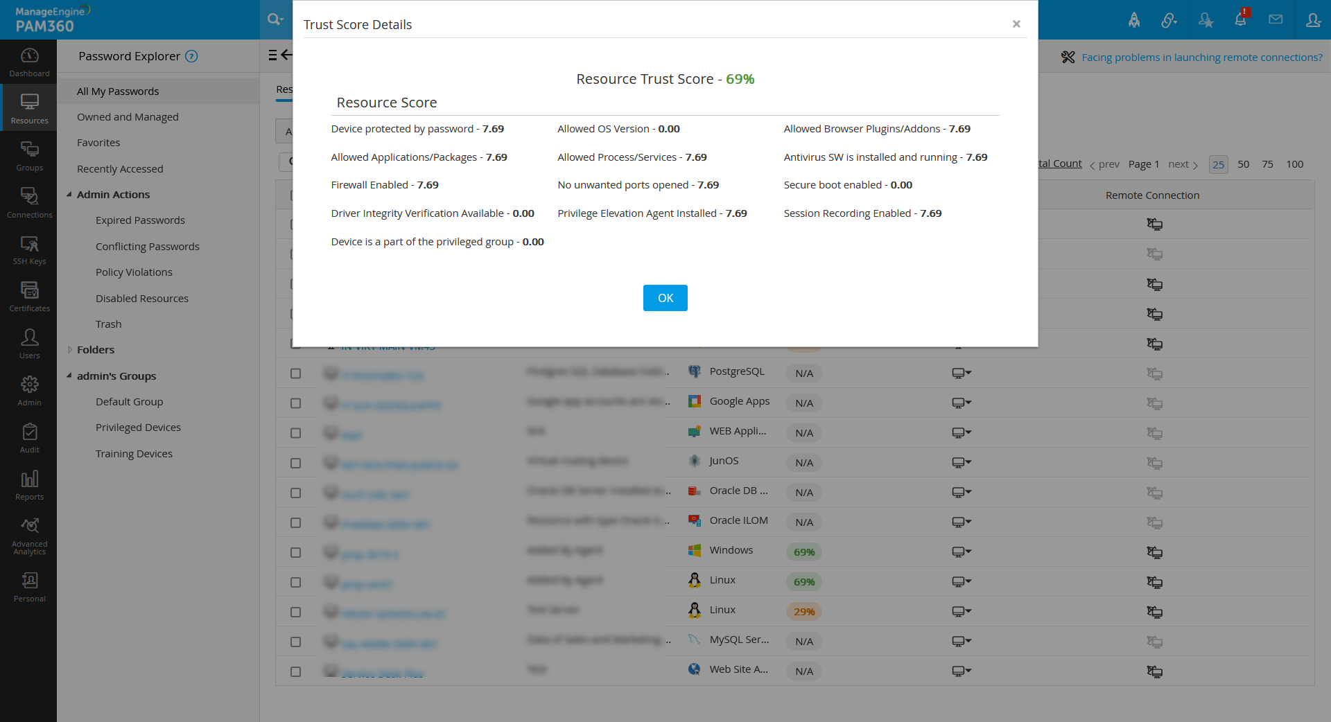 上の構成がない場合も、ユーザー信頼スコアは、Zero Trustアップグレード/インストールで定義した以下の条件に基づいて、PAM360 GUIに表示されます。