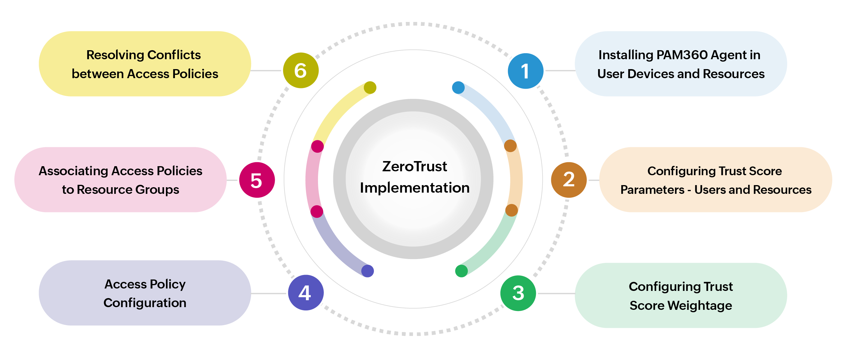 本書では、PAM360により、組織でのZero Trustアプローチの実装について詳細に学びます。Zero Trust実装プロセスについての詳細は、下のサブセクションを参照してください: