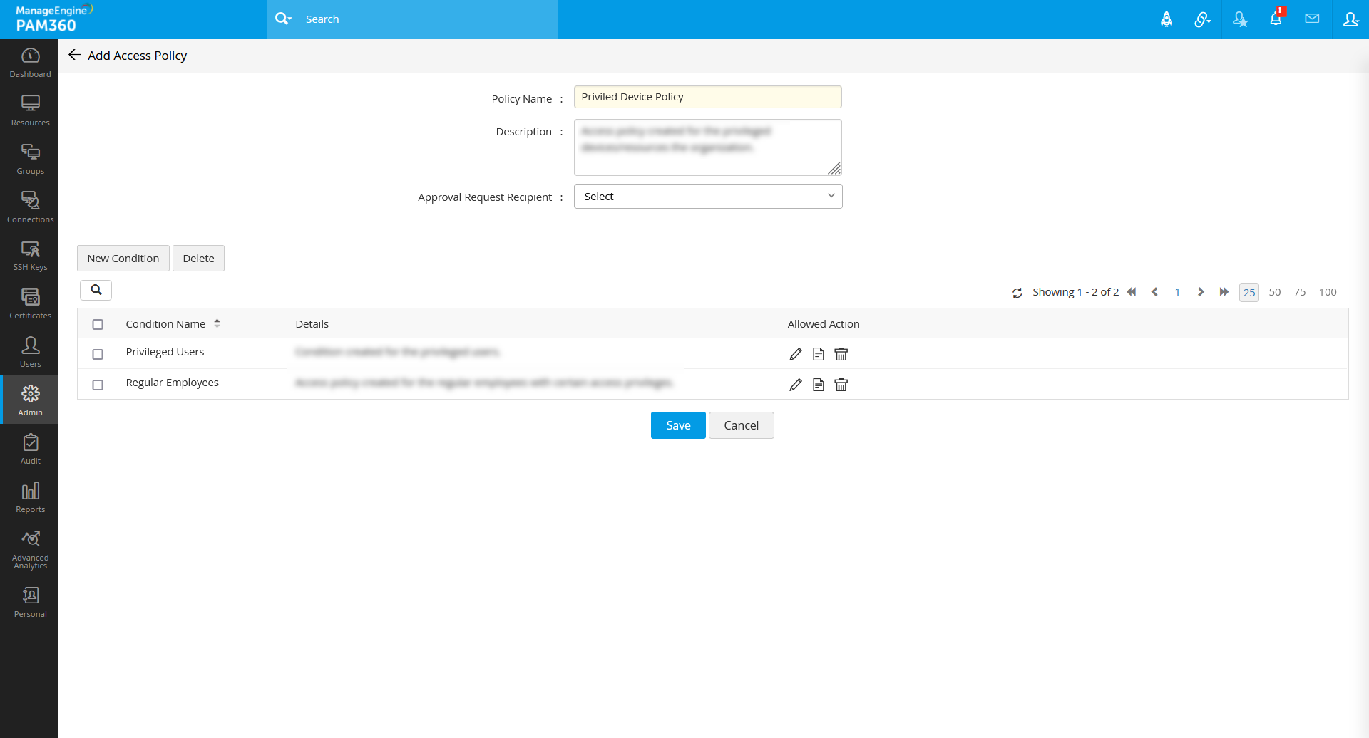 - 管理者ロールでは、アクセスポリシーでのコンフリクトの作成、管理および解決、アクセスポリシーの承認および他の管理者が作成したアクセスポリシーの表示ができます。