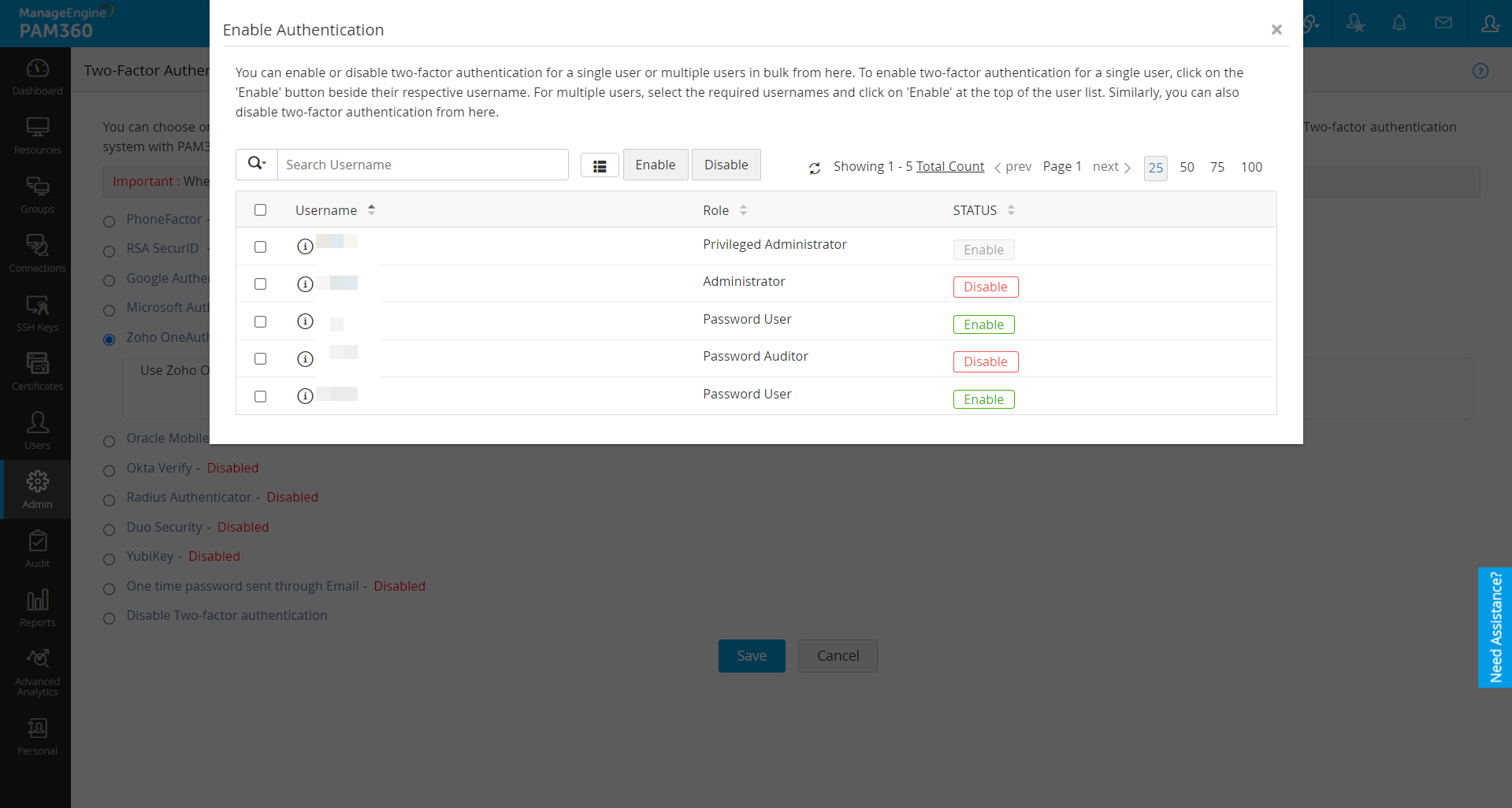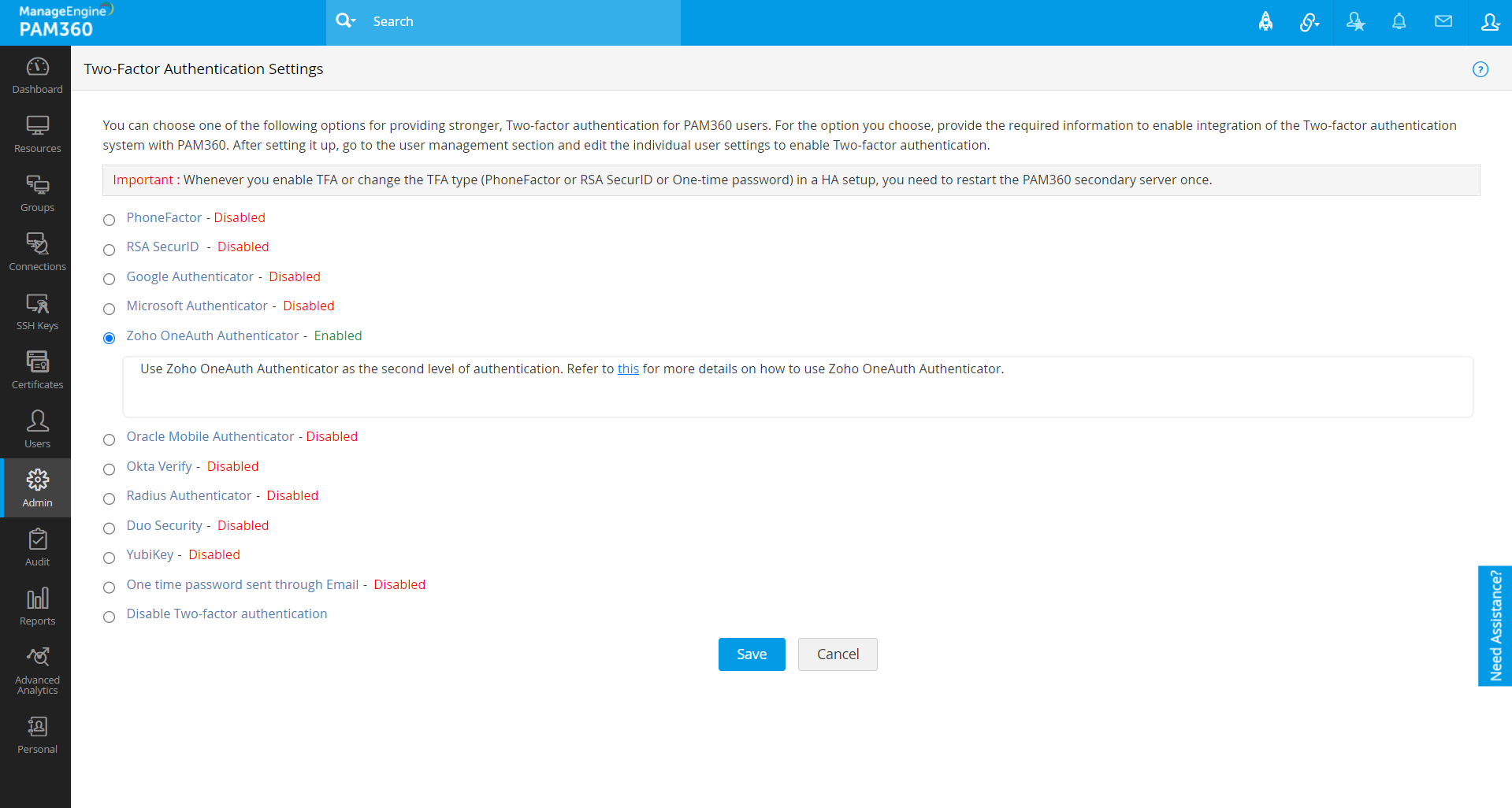 3.PAM360 Webインターフェイスに有効化されたZoho OneAuth - Authenticationで接続
