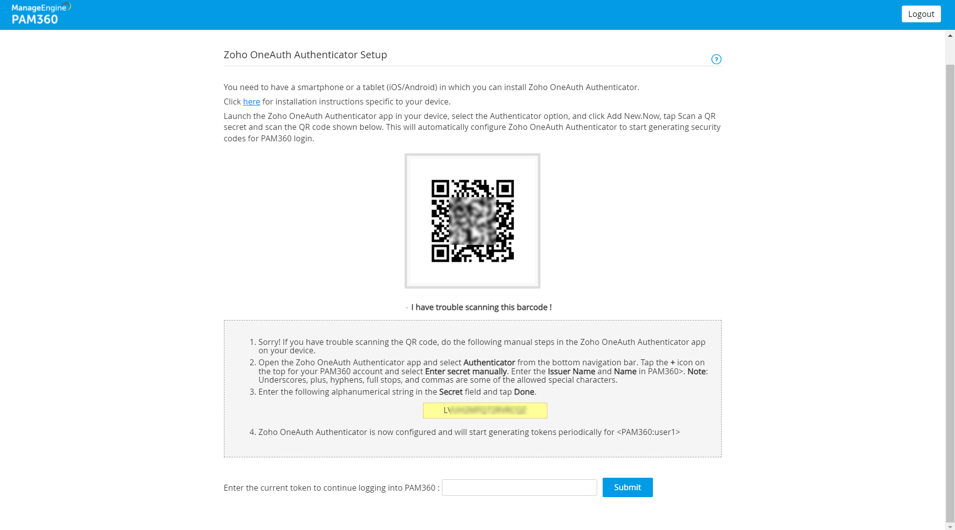 - [QRシークレットをスキャン]をクリックし、お使いのデバイスをPAM360 GUIに表示されたバーコードに当てます。これで、PAM360アカウントが、Zoho OneAuth - Authenticatorアプリケーションに自動的に構成され、PAM360に認証コードをの生成を開始します。